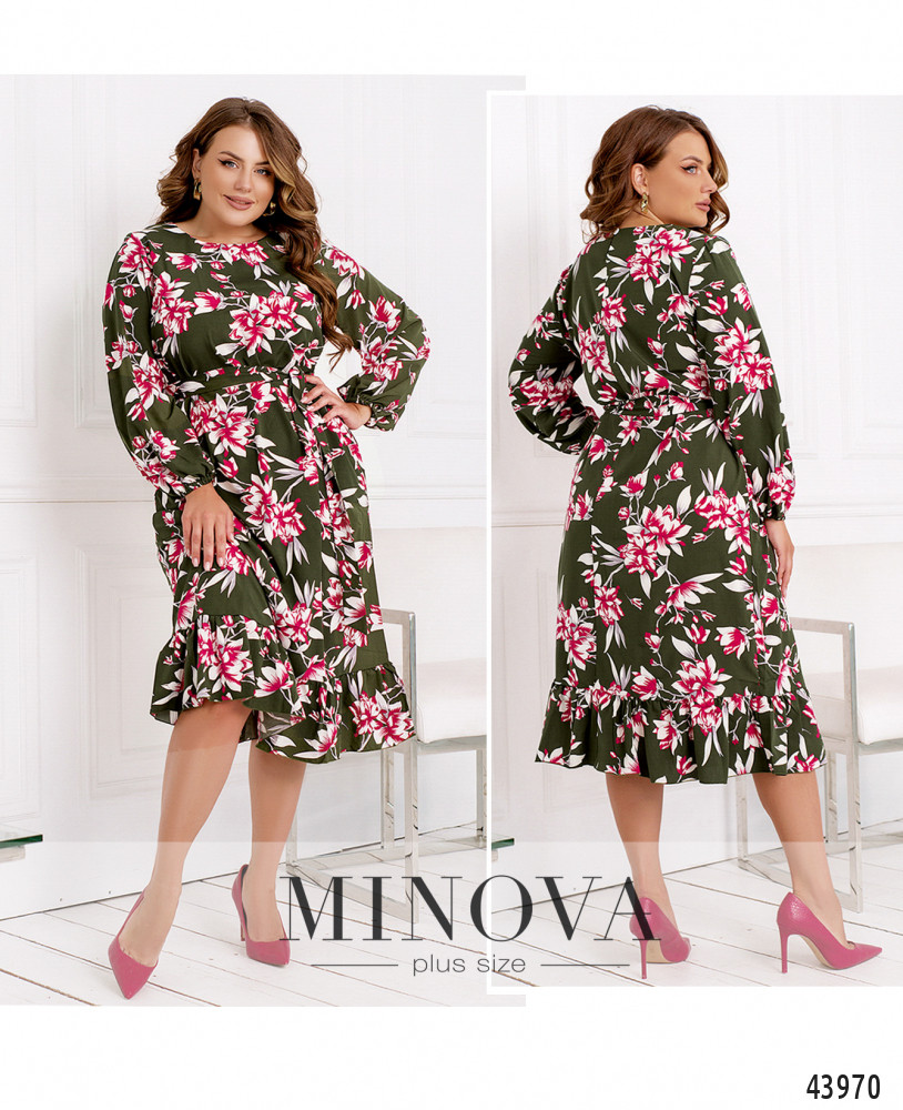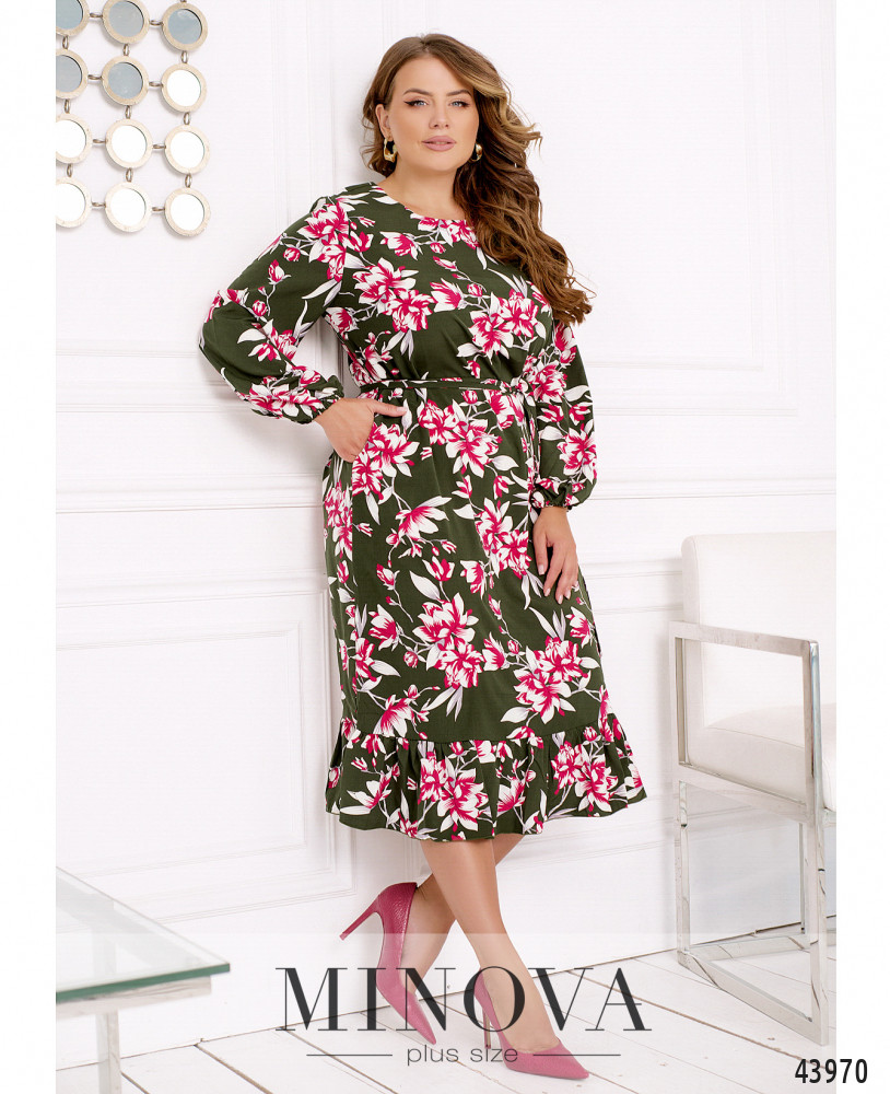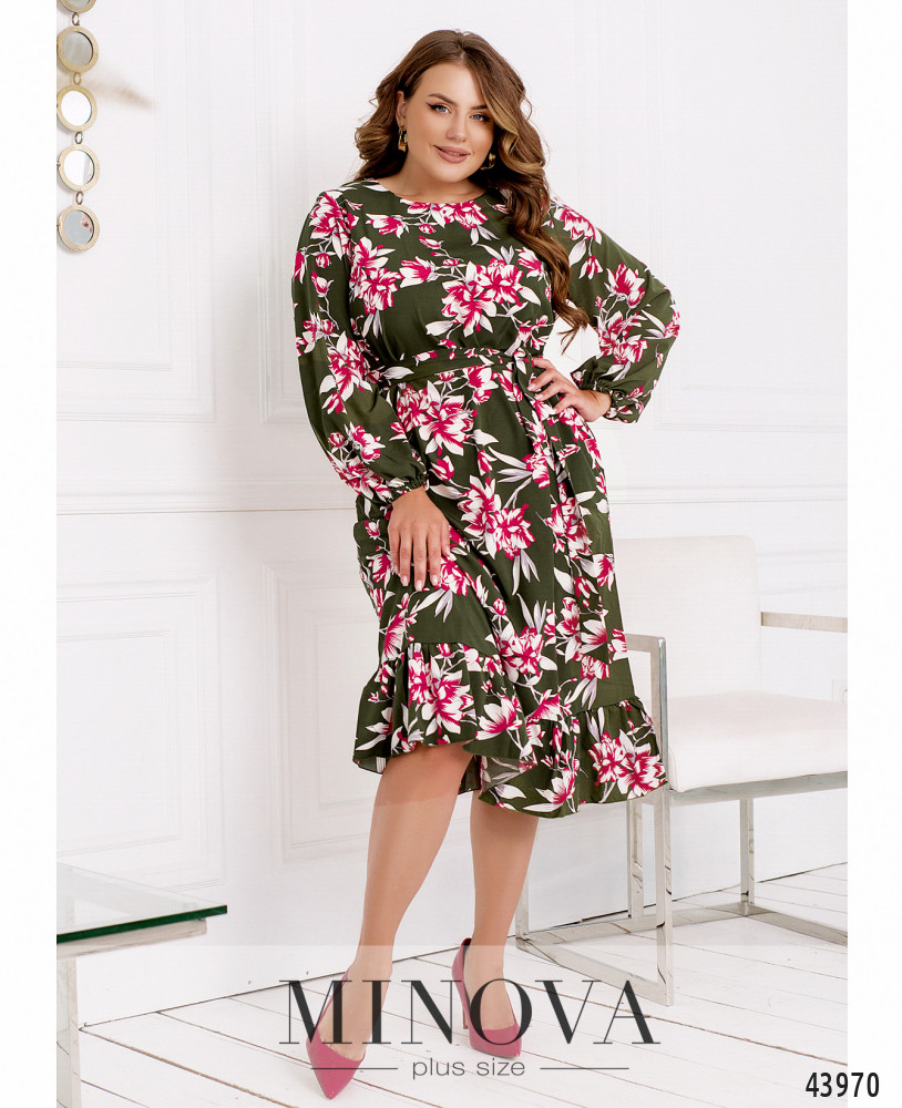 Нежное и романтичное платье батал, цельнокроеное, по бокам - карманы в шве. Подол украшен оборками, в рукава на запястьях вшиты резинки, ткань присобрана оборками на манжетах. Застёжка - пуговка сзади под шеей. В комплекте пояс в тон. Вырез горловины полукруглый.