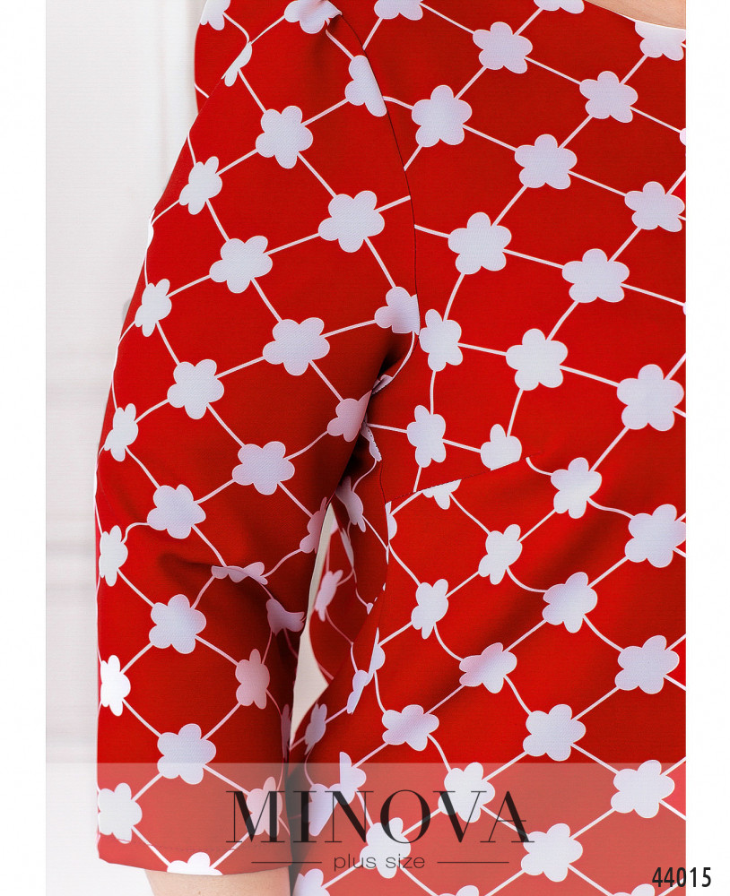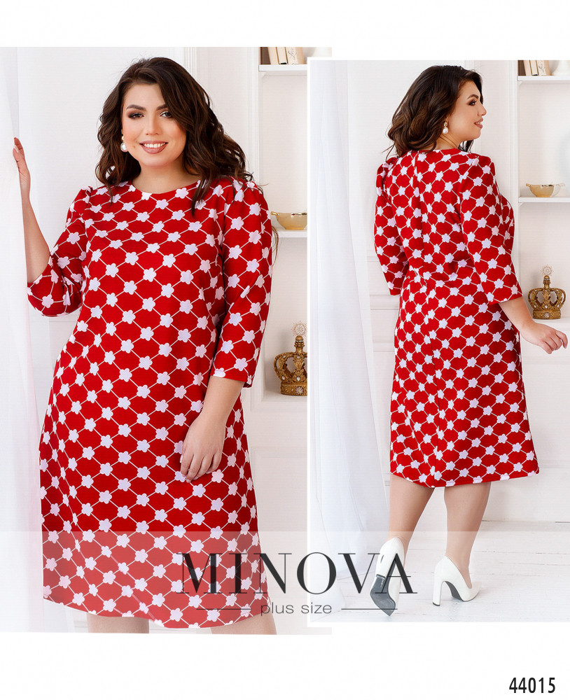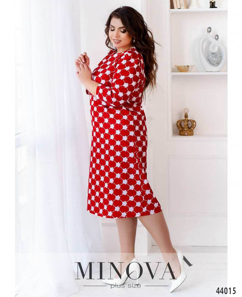 Нарядное и нежное платье большого размера с оригинальным принтом. Застёжек и карманов нет, вырез горловины полукруглый, рукава без манжет. На груди вытачки.