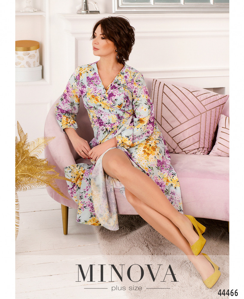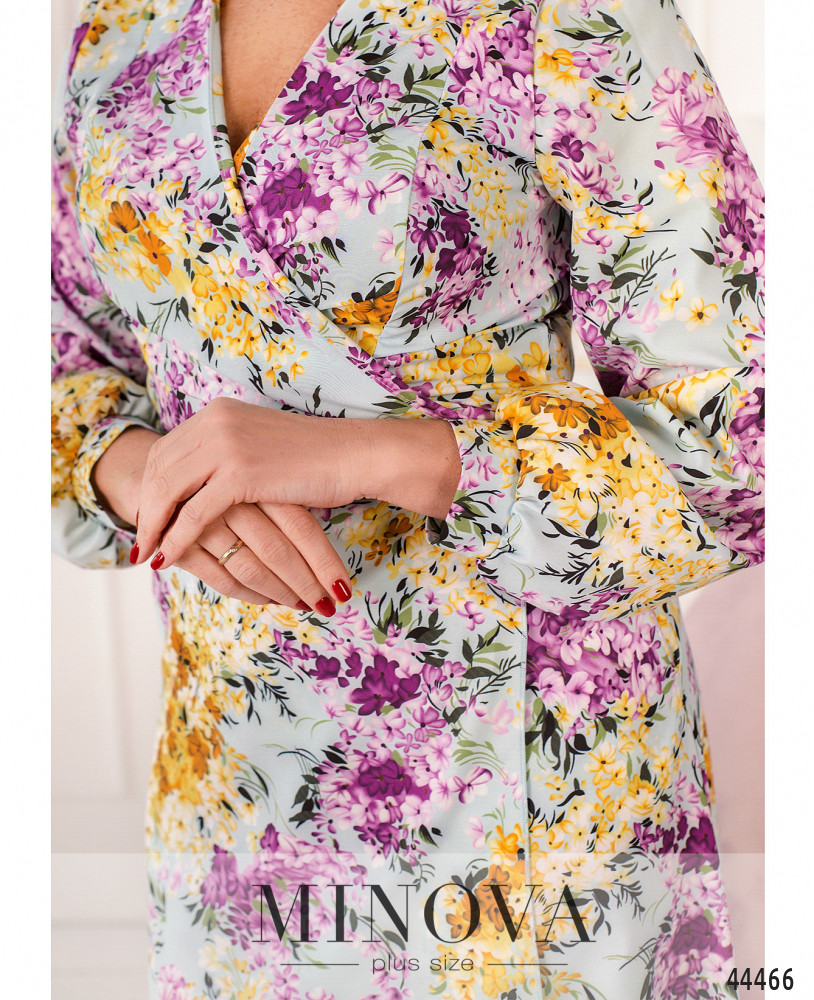 Нежное и яркое платье батал на запАх, по бокам - карманы в шве. Рукава с манжетами, на манжетах по одной пуговице. Завязывается с помощью ленты, продеваемой в отверстие на талии сбоку. Без подкладки. Подол отрезной.