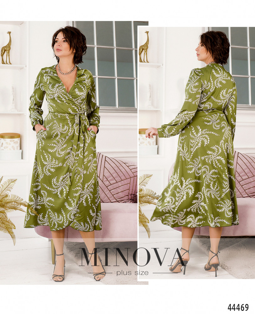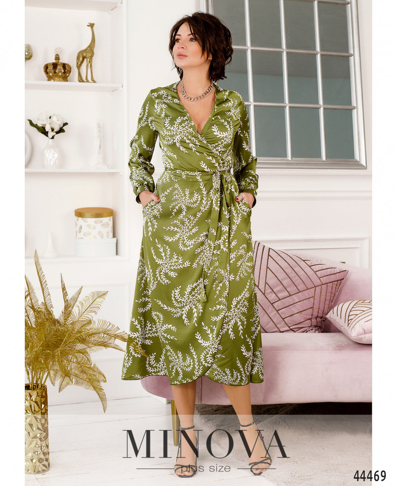 Нежное и яркое платье батал на запАх, по бокам - карманы в шве. Рукава с манжетами, на манжетах по одной пуговице. Завязывается с помощью ленты, продеваемой в отверстие на талии сбоку. Без подкладки. Подол отрезной.