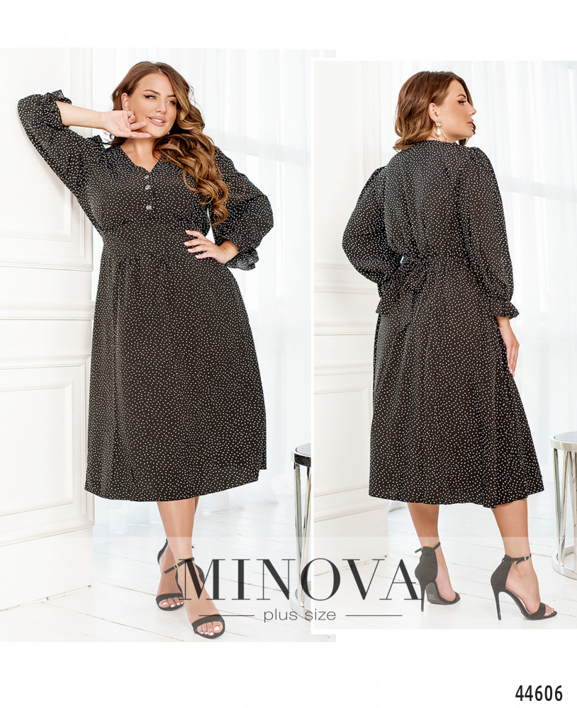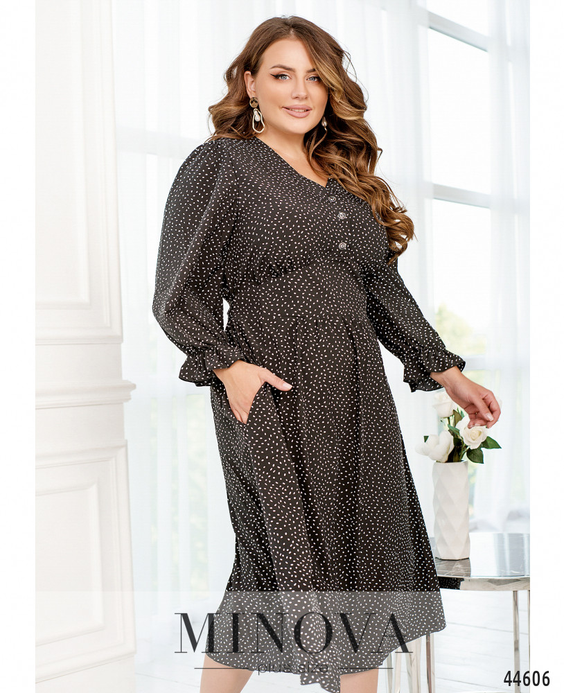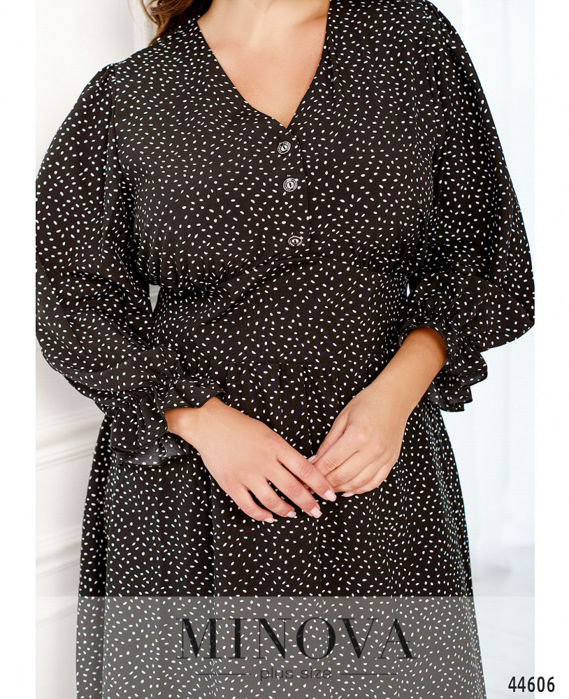 Оригинальное платье плюс сайз с отрезным лифом и подолом. На талии подшит пояс, который завязывается сзади. Также сзади в талию вшита резинка. По бокам - карманы в шве. На груди несколько небольших пуговиц, вырез горловины V-образный. В рукава на манжетах вшиты резинки, манжеты с оборками.