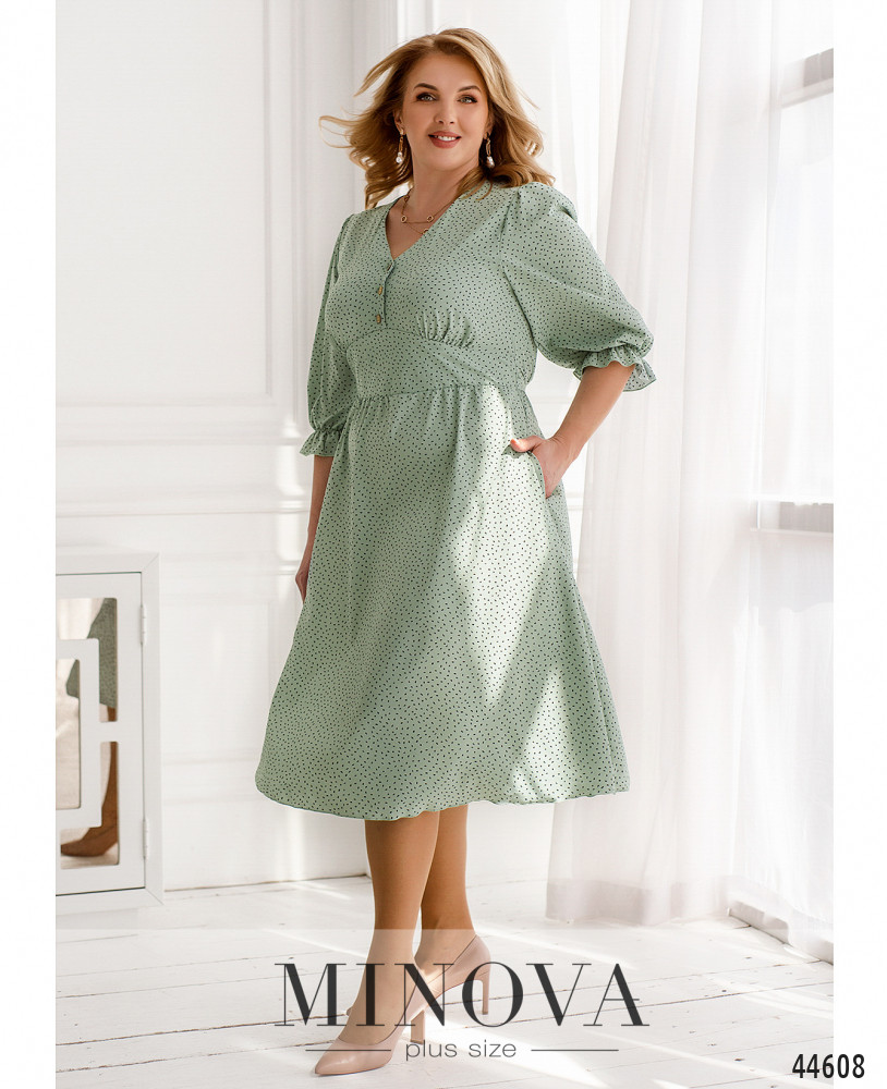 Оригинальное платье плюс сайз с отрезным лифом и подолом. На талии подшит пояс, который завязывается сзади. Также сзади в талию вшита резинка. По бокам - карманы в шве. На груди несколько небольших пуговиц, вырез горловины V-образный. В рукава на манжетах вшиты резинки, манжеты с оборками.