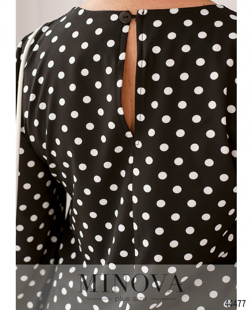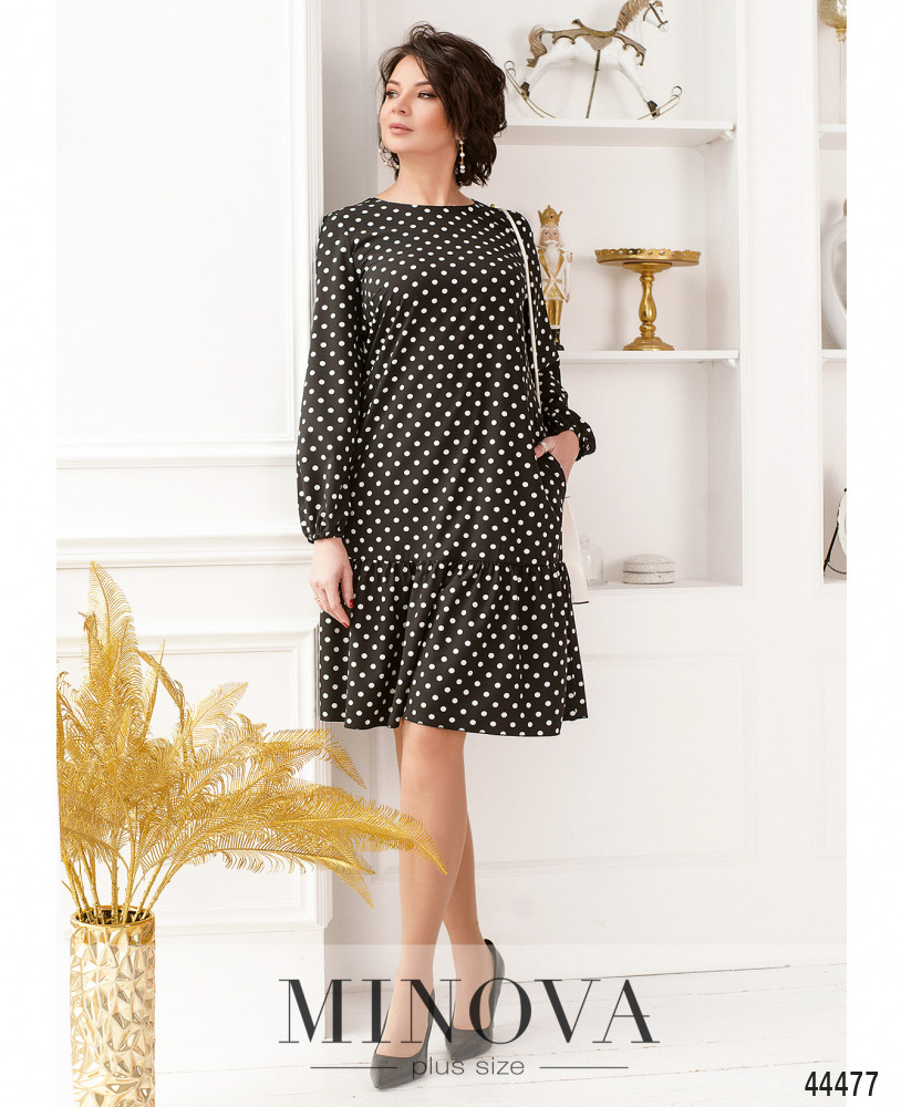 Стильное платье плюс сайз А-силуэта, украшенное оборками на подоле. Застёжка - пуговка сзади под шеей, по бокам - карманы в шве. В рукава на запястьях вшиты резинки. На груди вытачки. Вырез горловины полукруглый.