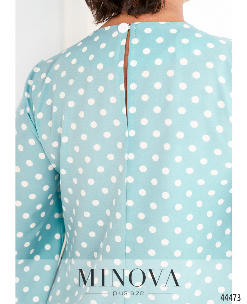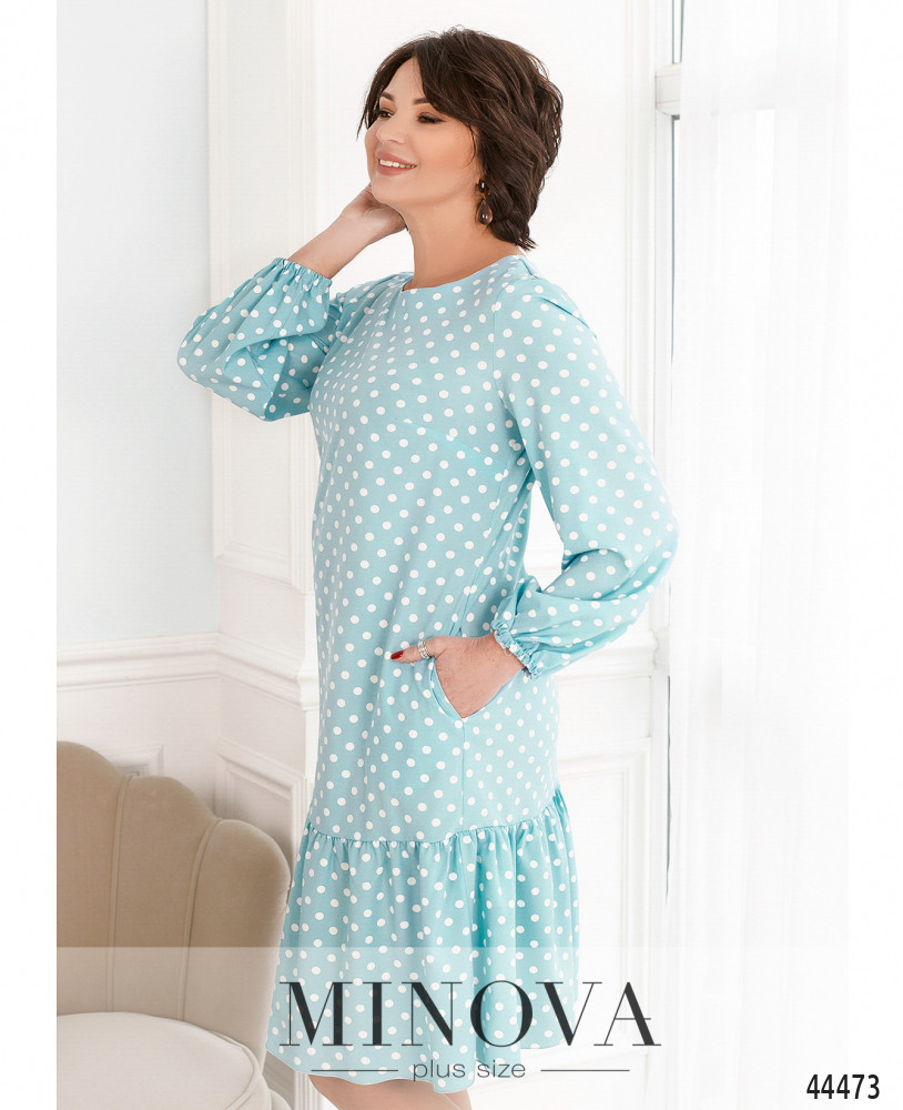 Стильное платье плюс сайз А-силуэта, украшенное оборками на подоле. Застёжка - пуговка сзади под шеей, по бокам - карманы в шве. В рукава на запястьях вшиты резинки. На груди вытачки. Вырез горловины полукруглый.