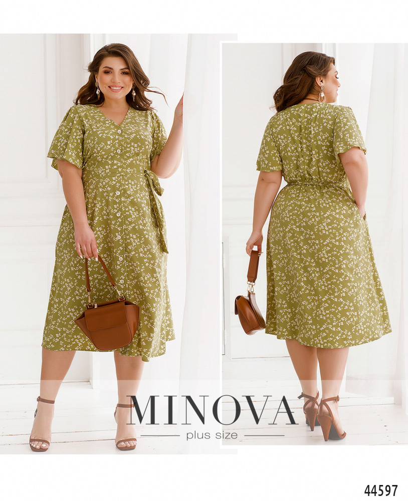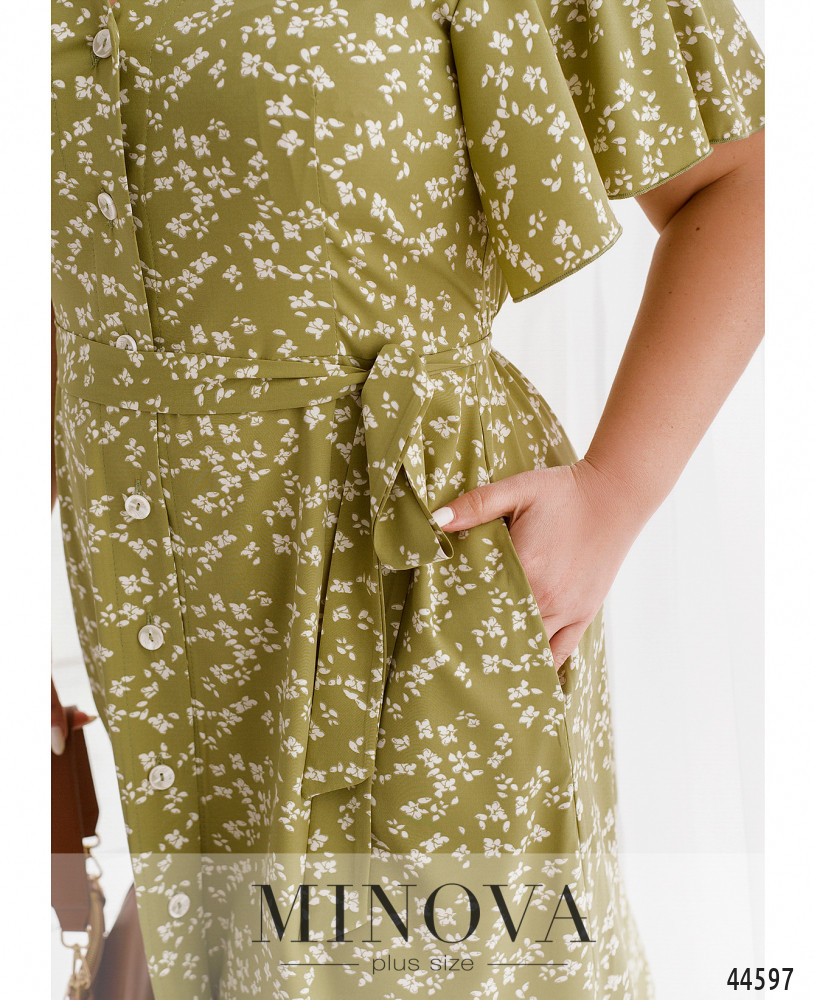Элегантное и нежное платье батал с рукавами-крылышками, по бокам - карманы в шве, застёгивается на ряд пуговиц спереди на планке. Подол отрезной, в талию сзади вшита резинка, вырез горловины V-образный.