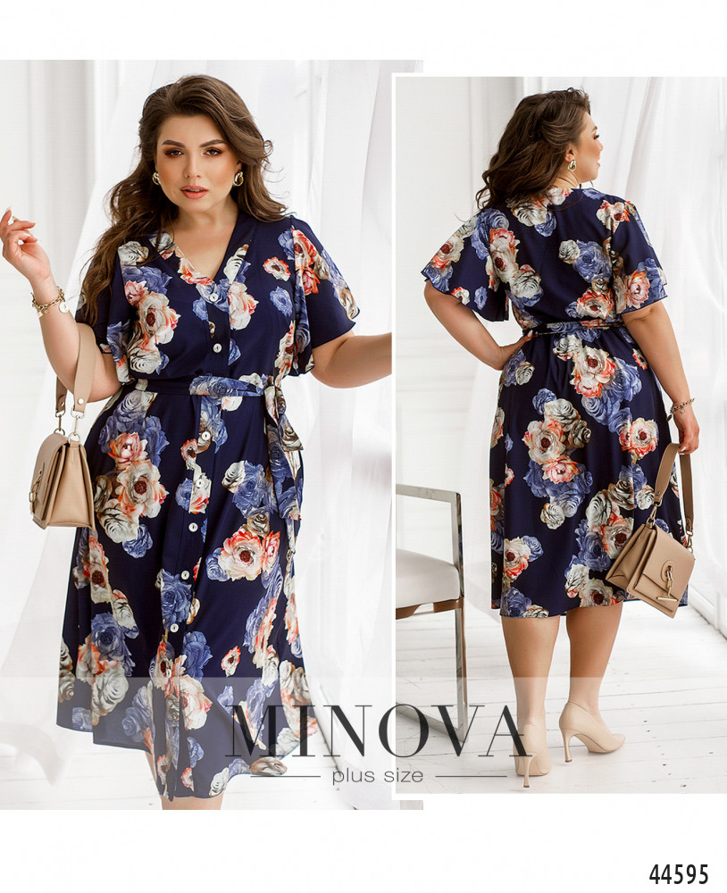 Элегантное и нежное платье батал с рукавами-крылышками, по бокам - карманы в шве, застёгивается на ряд пуговиц спереди на планке. Подол отрезной, в талию сзади вшита резинка, вырез горловины V-образный.