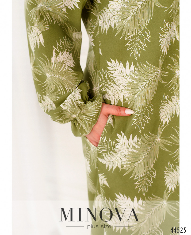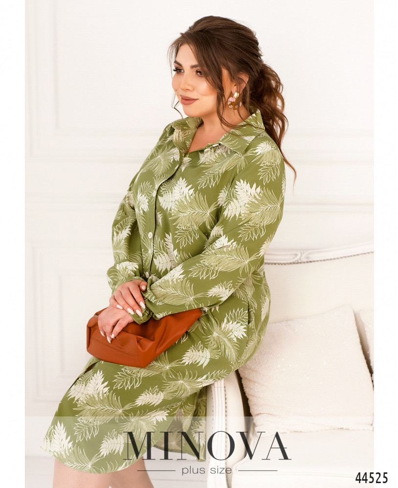 Нежное и яркое платье батал с отложным воротничком и рядом пуговиц спереди на планке, от воротничка до низа подола. По бокам - карманы в шве. Подкладки нет. Рукава со вшитыми в запястья резинками и небольшими оборками-манжетами.