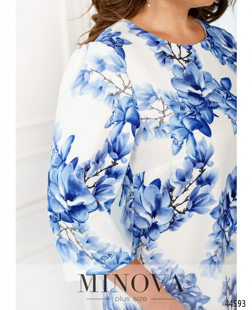 Нежное платье батал без застёжек и карманов, рукава без манжет, вырез горловины полукруглый. На груди диагональные вытачки. Принт весенний, очень привлекательный.