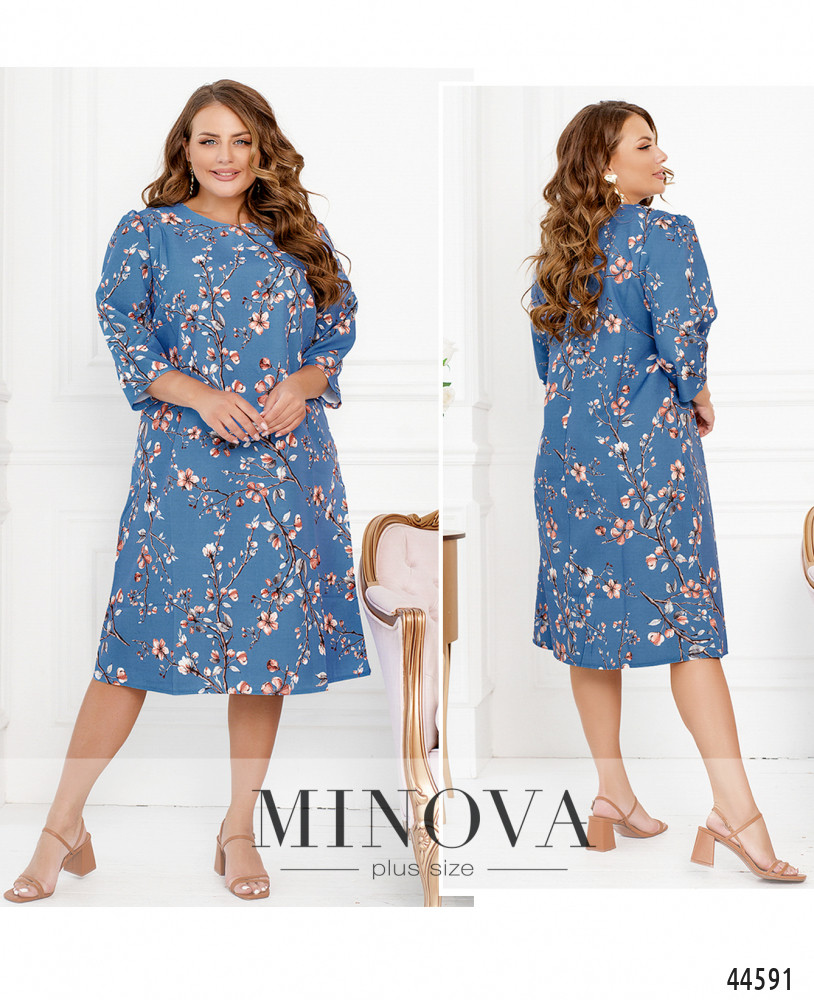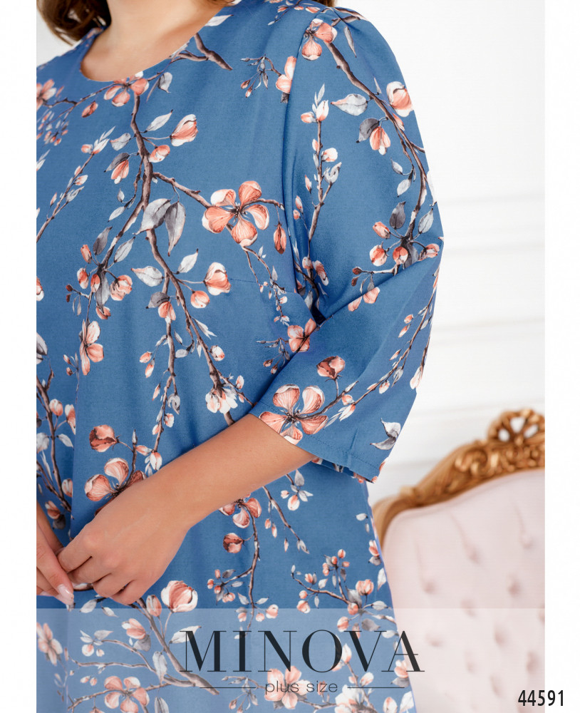 Нежное платье батал без застёжек и карманов, рукава без манжет, вырез горловины полукруглый. На груди диагональные вытачки. Принт весенний, очень привлекательный.