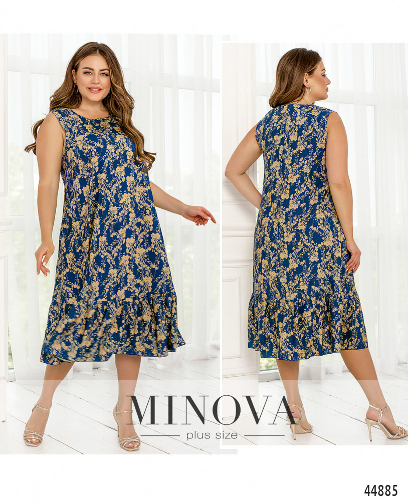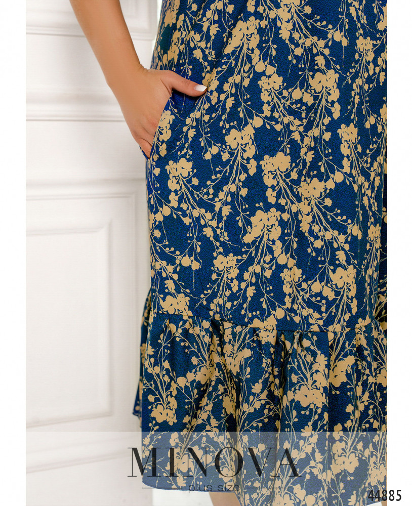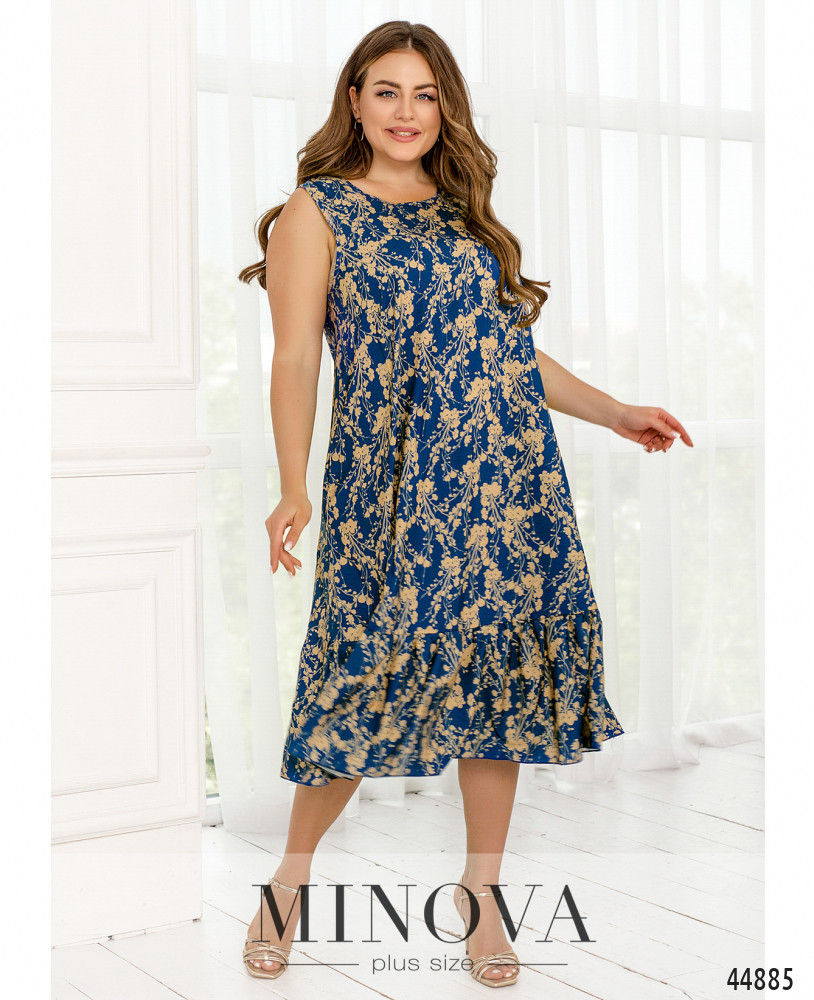 Женственное платье батал без рукавов, вырез горловины полукруглый, на подоле - мягкие оборки. По бокам карманы в шве. Застёжек нет.