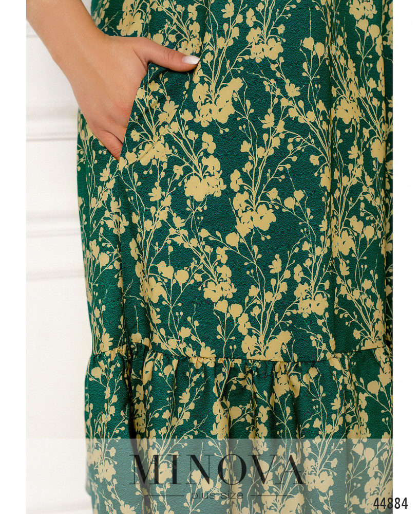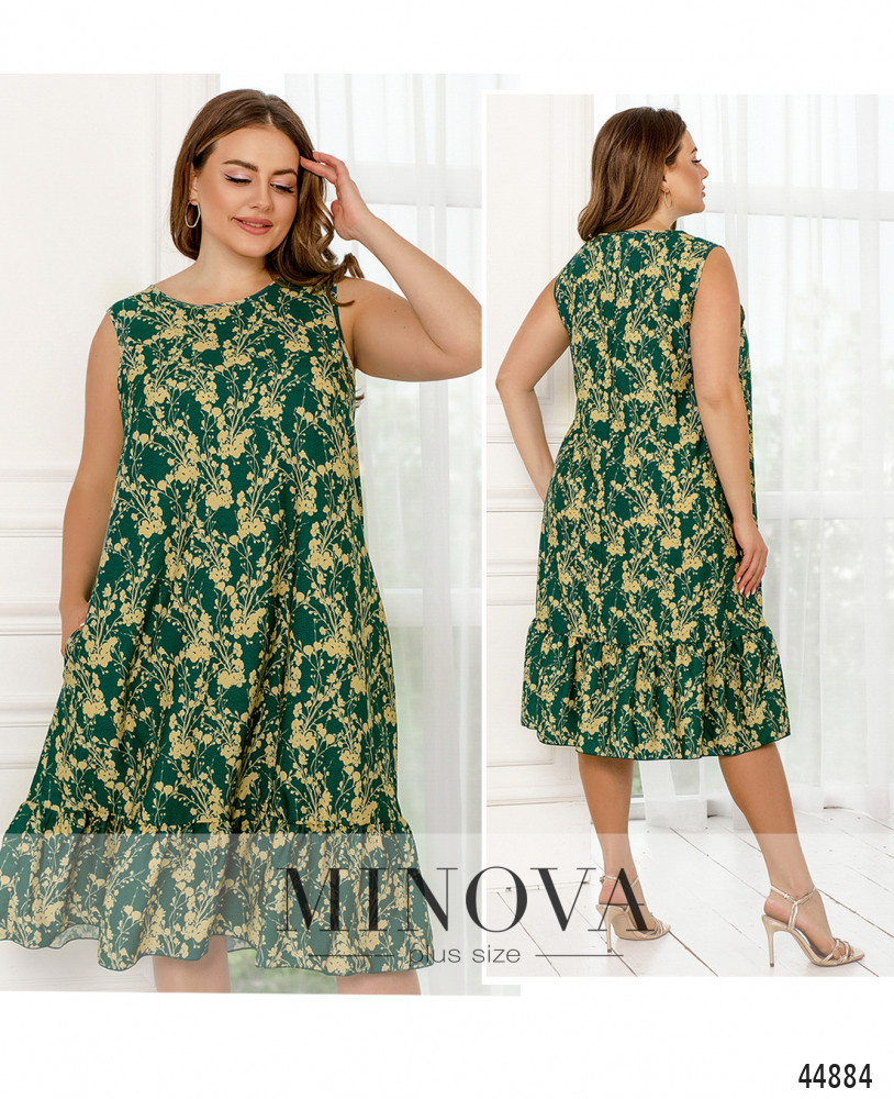 Женственное платье батал без рукавов, вырез горловины полукруглый, на подоле - мягкие оборки. По бокам карманы в шве. Застёжек нет.