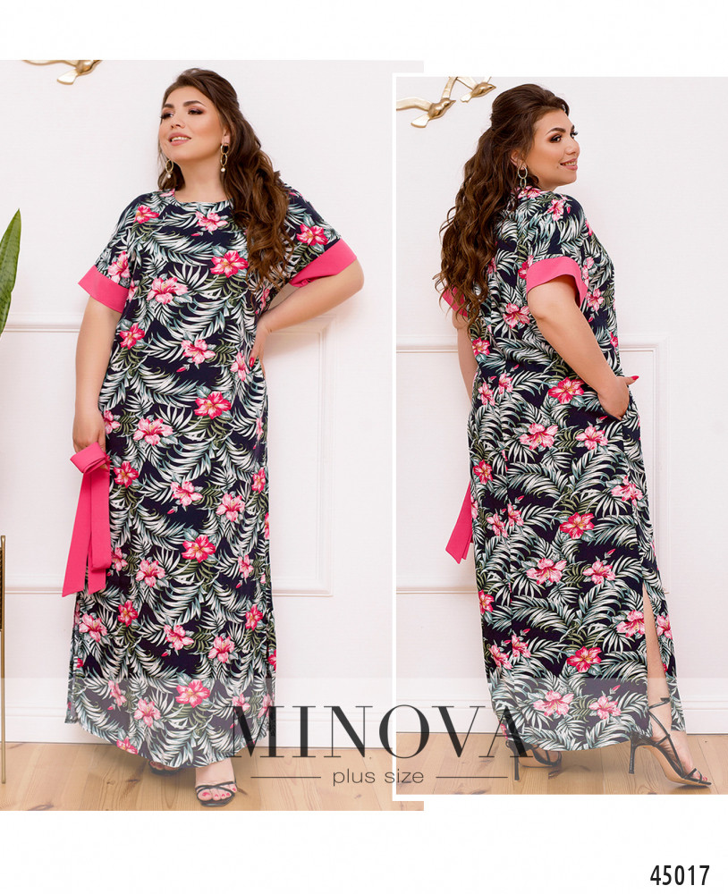 Яркое и нарядное платье батал с полукруглым вырезом горловины, по бокам подола - длинные разрезы. Рукава с контрастными манжетами. По бокам - карманы в шве. Застёжек нет.
