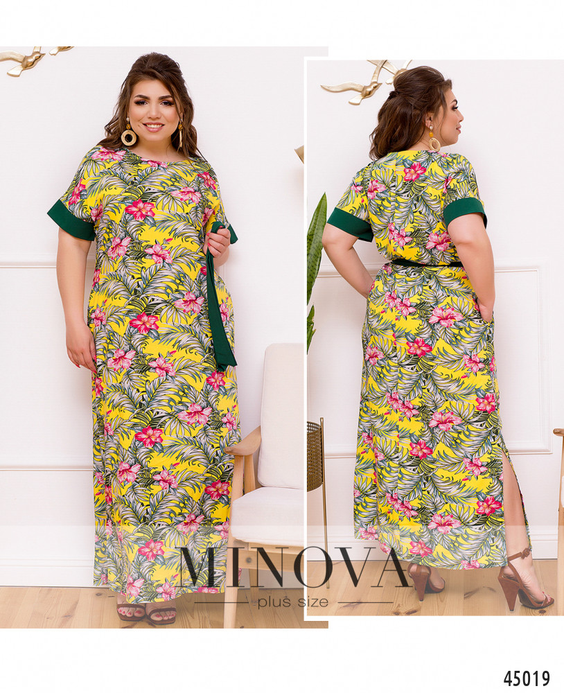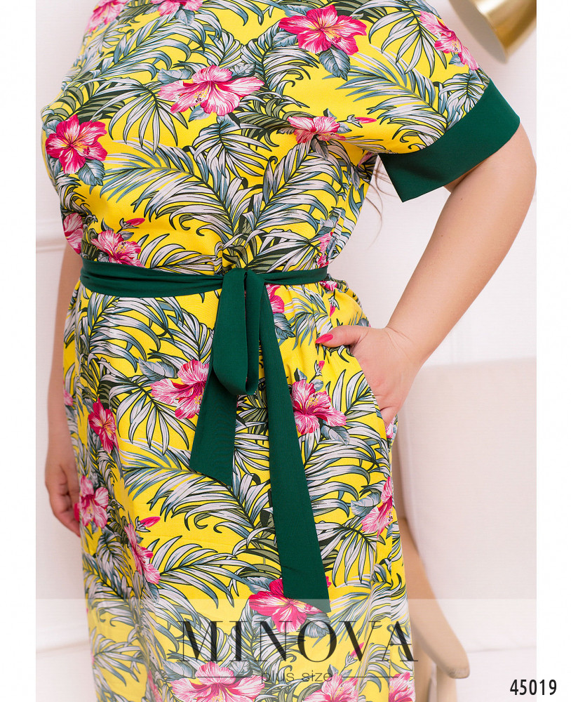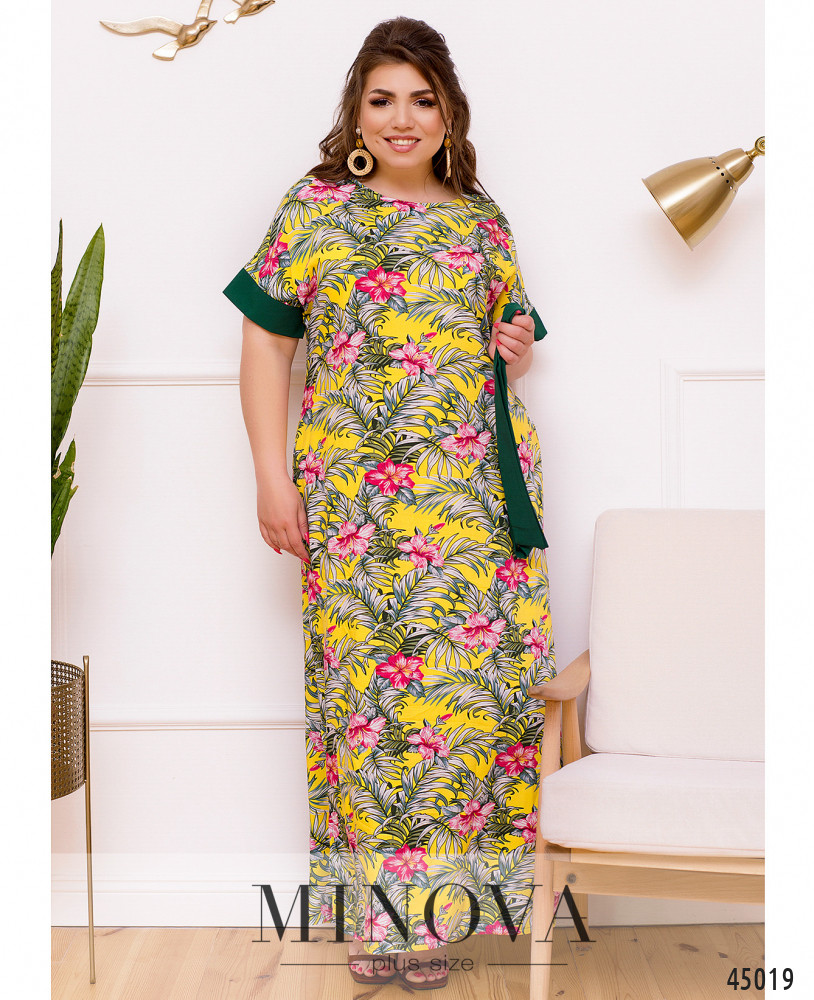 Яркое и нарядное платье батал с полукруглым вырезом горловины, по бокам подола - длинные разрезы. Рукава с контрастными манжетами. По бокам - карманы в шве. Застёжек нет.