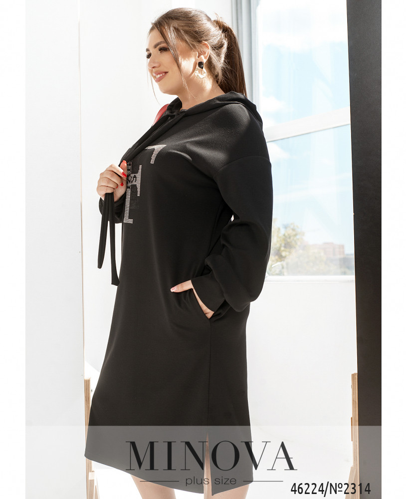 Стильное спортивное платье может стать любимой вещью для женщины, ценящей практичность и не забывающей о модных тенденциях. Модель дополнена длинными рукавами с манжетами и приспущенной линией плеч, а также карманами в боковых швах и капюшоном. Платье украшает декоративная аппликация спереди.