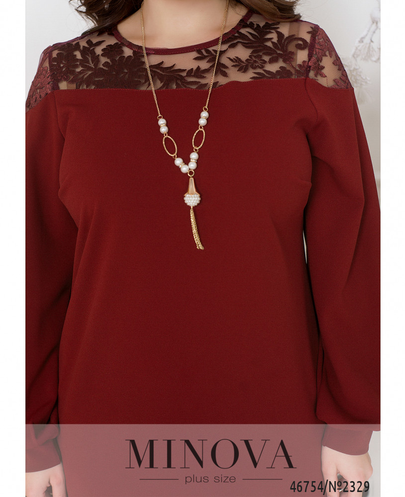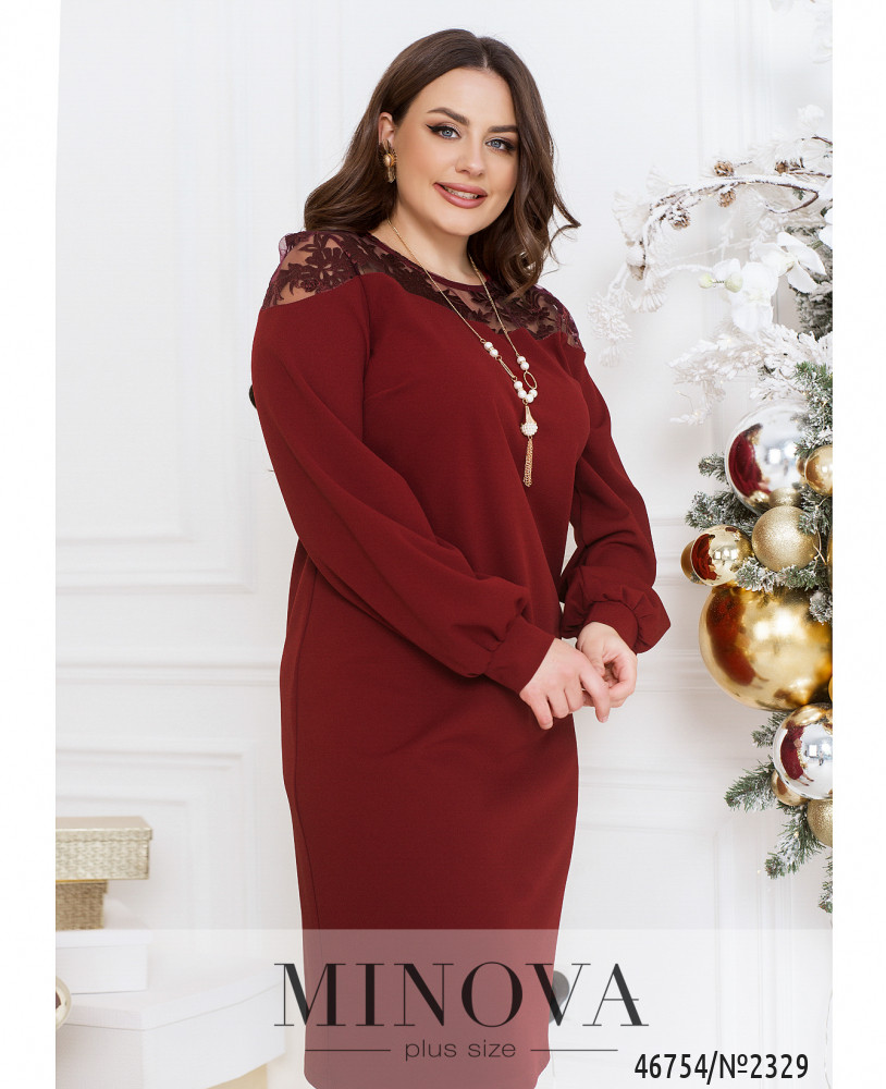 Изящное женственное платье с вставкой и тонкого кружева на плечах – универсальное решение для любой модницы. В нем вполне можно появиться как в офисе, так и на корпоративе или празднике. Модель без застежек и карманов дополнена длинными рукавами  с манжетами и нагрудными вытачками, обеспечивающими идеальную посадку на груди.