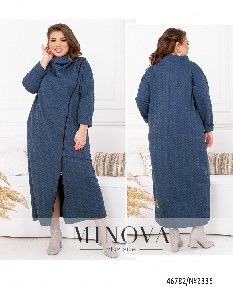 Теплое платье-миди, выполненное из мягкой структурной ткани, отличается универсальностью, а также удачно вписываются в любой стиль. Модель с высоким цельнокроеным воротником дополнена длинными рукавами с приспущенной линией плеч и большим накладным карманом спереди. Платье застегивается на змейку, вшитую спереди по диагонали.