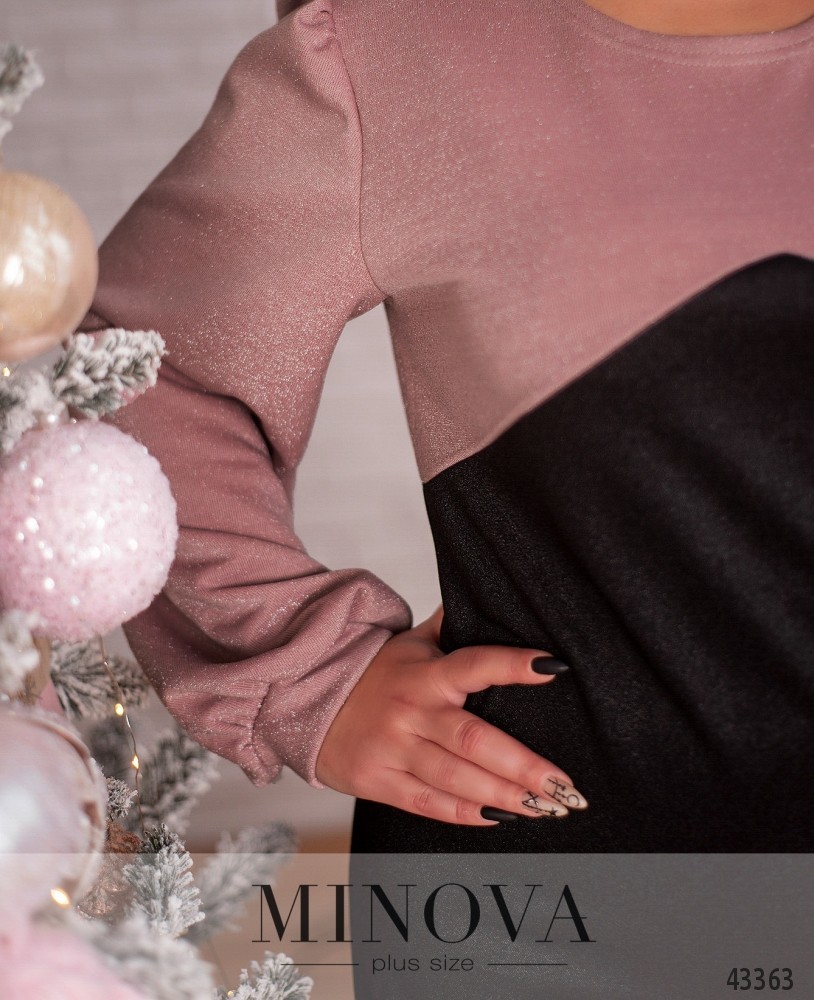 Элегантное минималистичное платье плюс сайз, без застёжек и карманов. Рукава с мягкими манжетами, без пуговиц. Верх контрастный, по спинке ровная линия, спереди - треугольная. Ткань с люрексом.