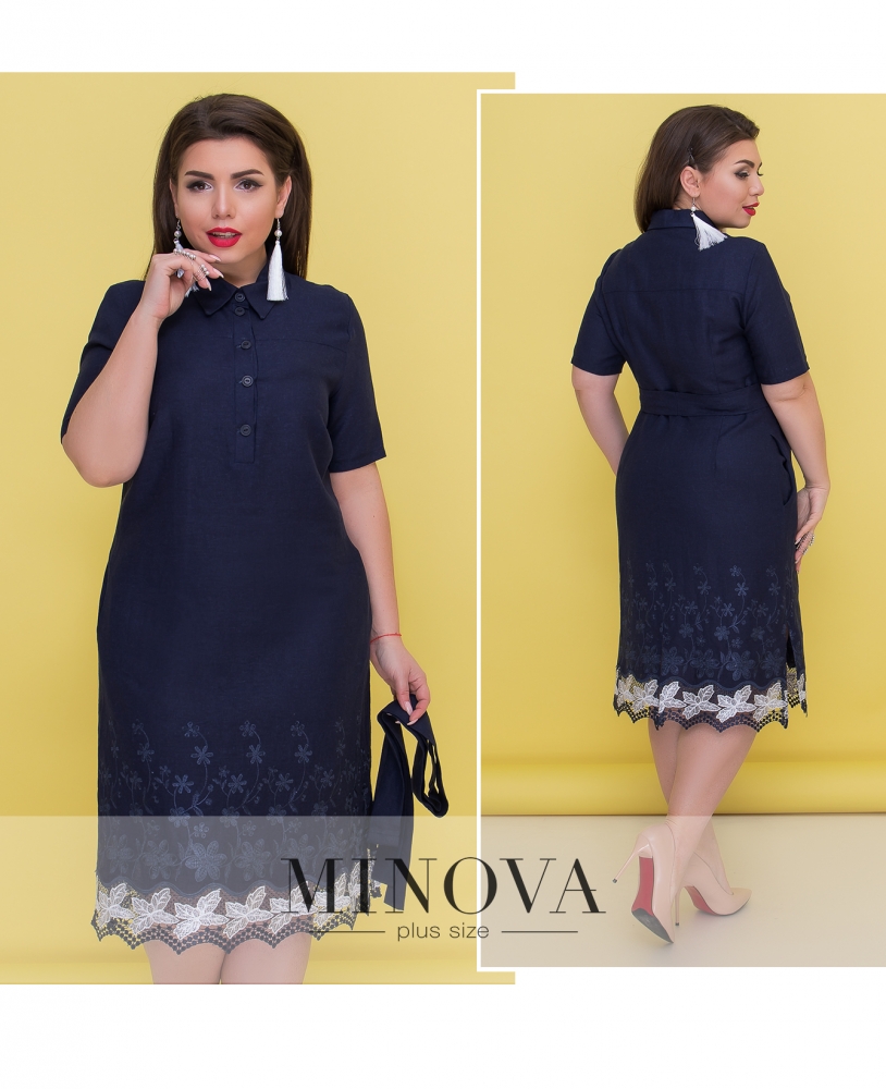 Летнее льняное платье-рубашка прямого кроя с поясом, короткими рукавами и вышитым подолом. На груди платье застегивается на пуговицы. Подол платья дополнен карманами и двумя боковыми разрезами. На спине есть выточки и разрез по линии шага.