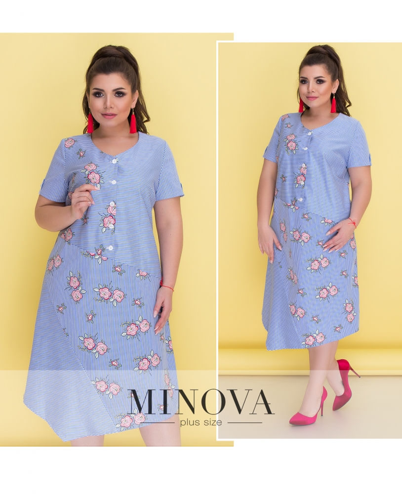 Платье асимметричного кроя с короткими рукавами. Рукава дополнены декоративными пуговицами. Лиф платья застегивается на пуговицы. Подол дополнен отрезной вставкой по диагонали.