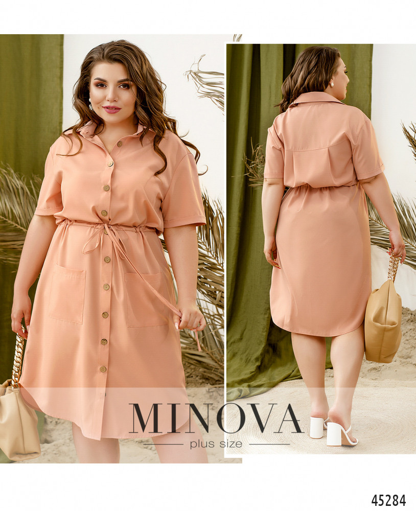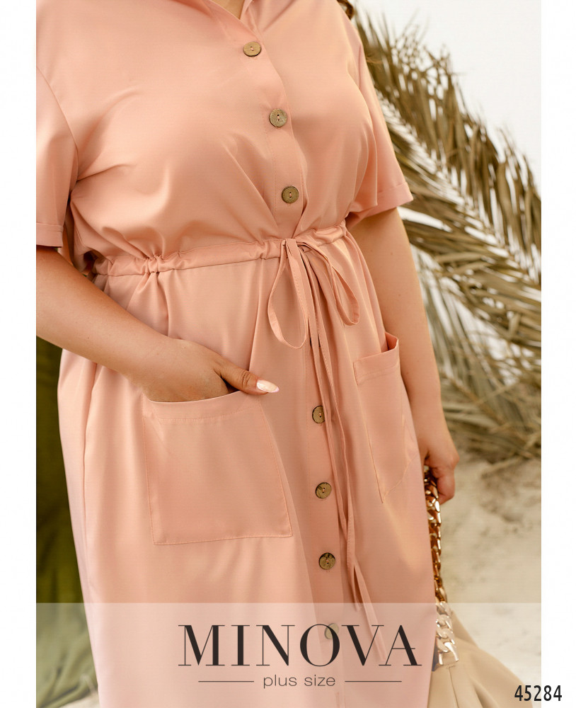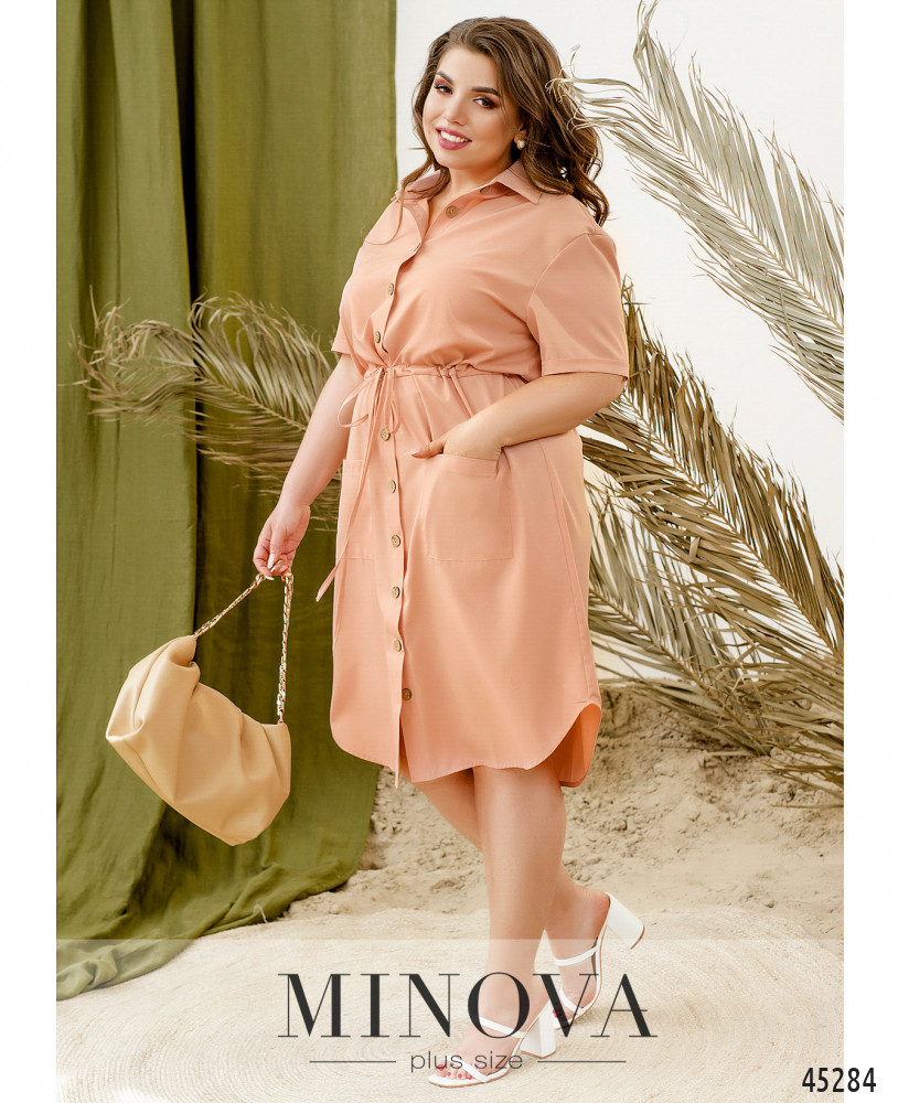 Минималистичное однотонное платье-рубашка с короткими рукавами - идеальное решение для жаркого летнего дня. Модель с воротником и пуговицами на планке спереди дополнена накладными карманами на бедрах и декоративным шнурком, вшитым в талию, который дает возможность подчеркнуть талию.