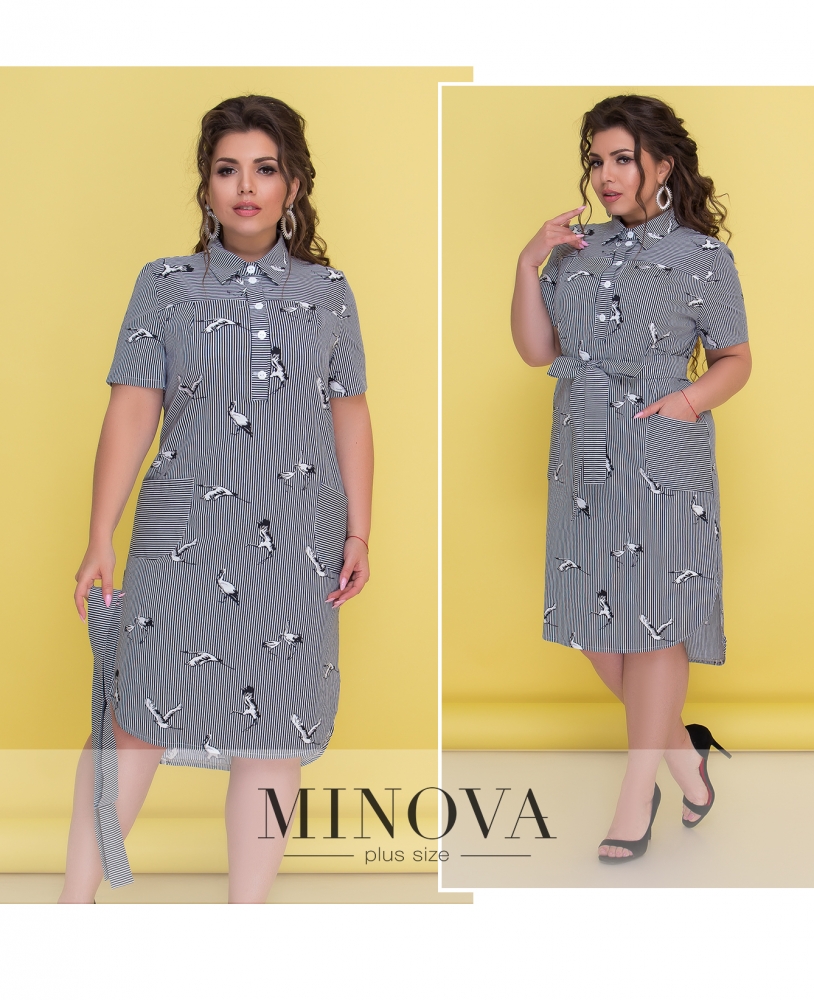 Платье-рубашка спринтом и мягким съемным поясом. Платье с короткими рукавами и с воротом на пуговицах. Лиф и спинка с кокеткой. Подол удлинен и дополнен разрезами и накладными карманами.