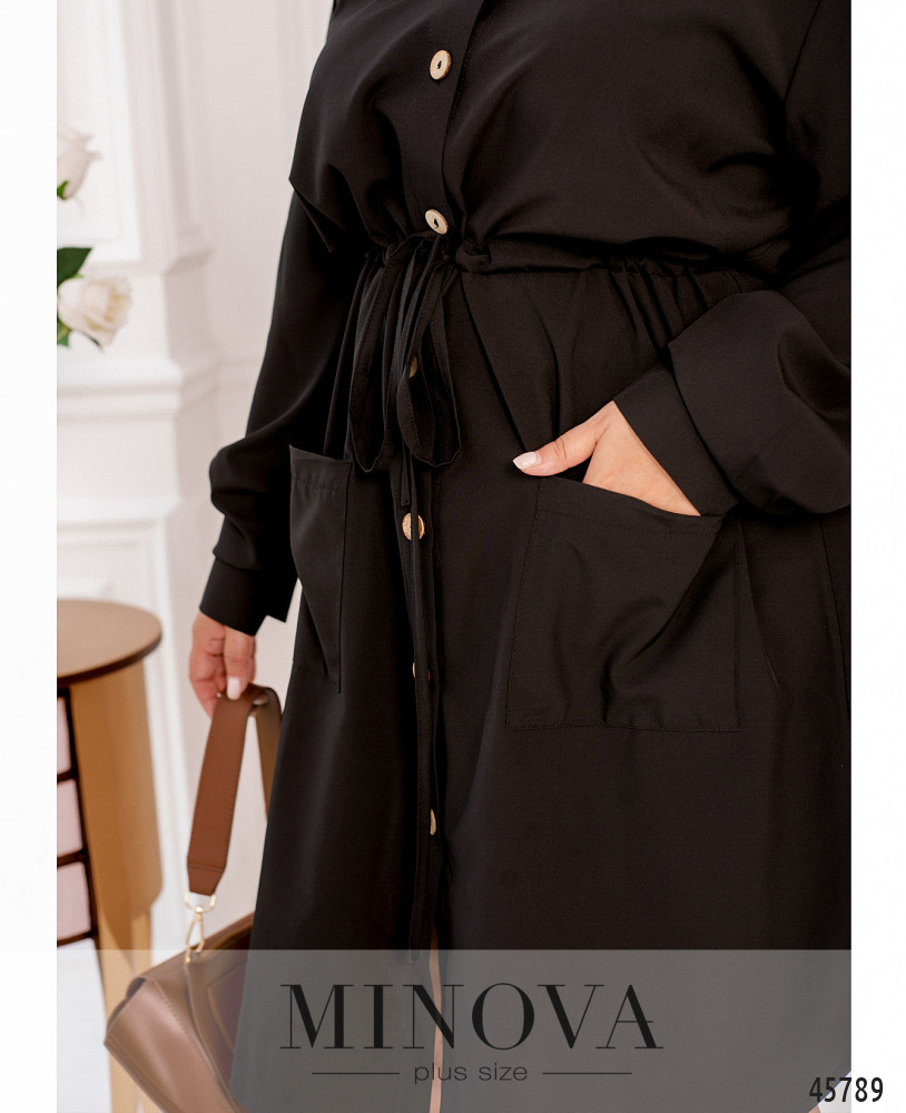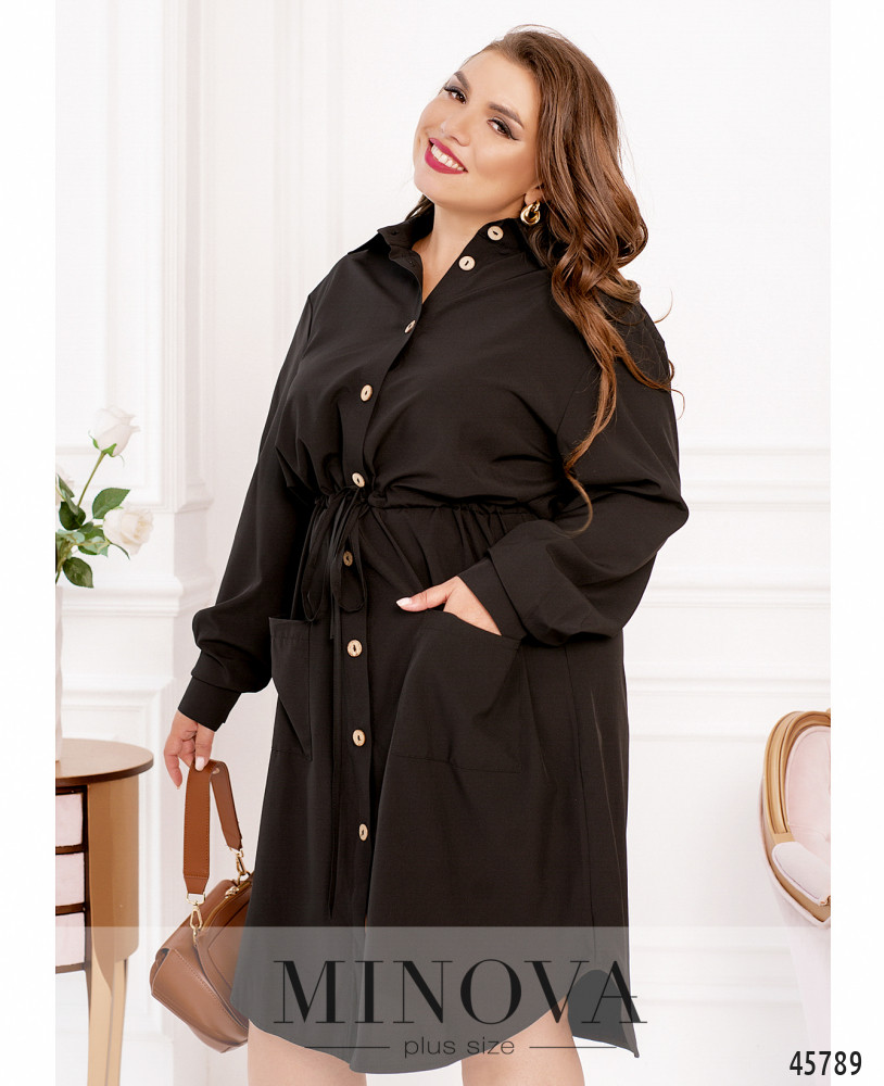 Минималистичное однотонное платье-рубашка с длинными рукавами - идеальное решение для жаркого летнего дня. Модель с воротником и пуговицами на планке спереди дополнена накладными карманами на бедрах и декоративным шнурком, вшитым в талию, который дает возможность подчеркнуть талию.