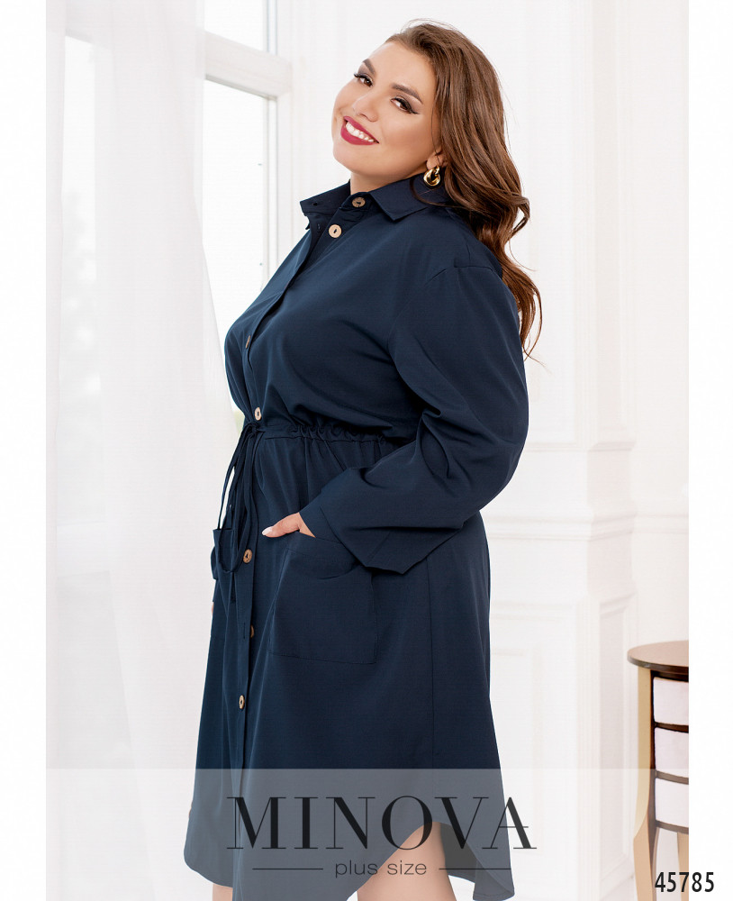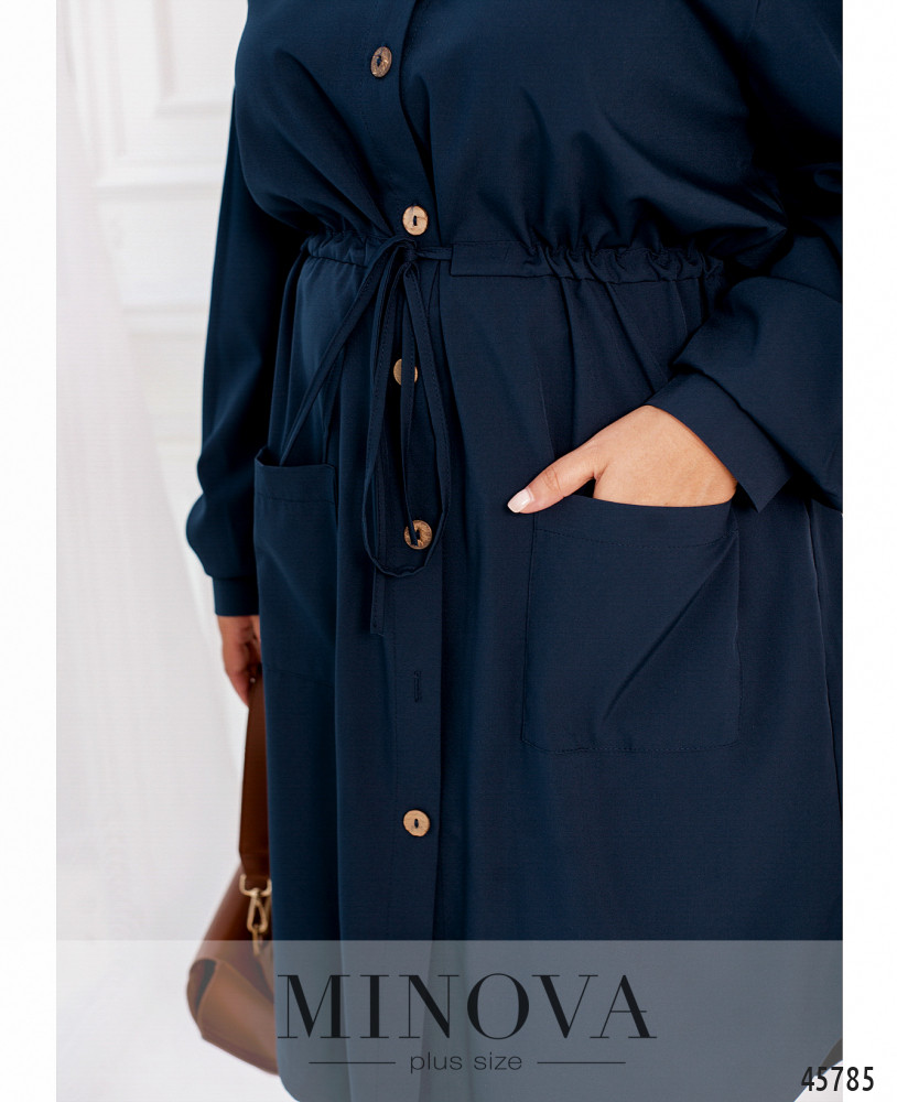 Минималистичное однотонное платье-рубашка с длинными рукавами - идеальное решение для жаркого летнего дня. Модель с воротником и пуговицами на планке спереди дополнена накладными карманами на бедрах и декоративным шнурком, вшитым в талию, который дает возможность подчеркнуть талию.