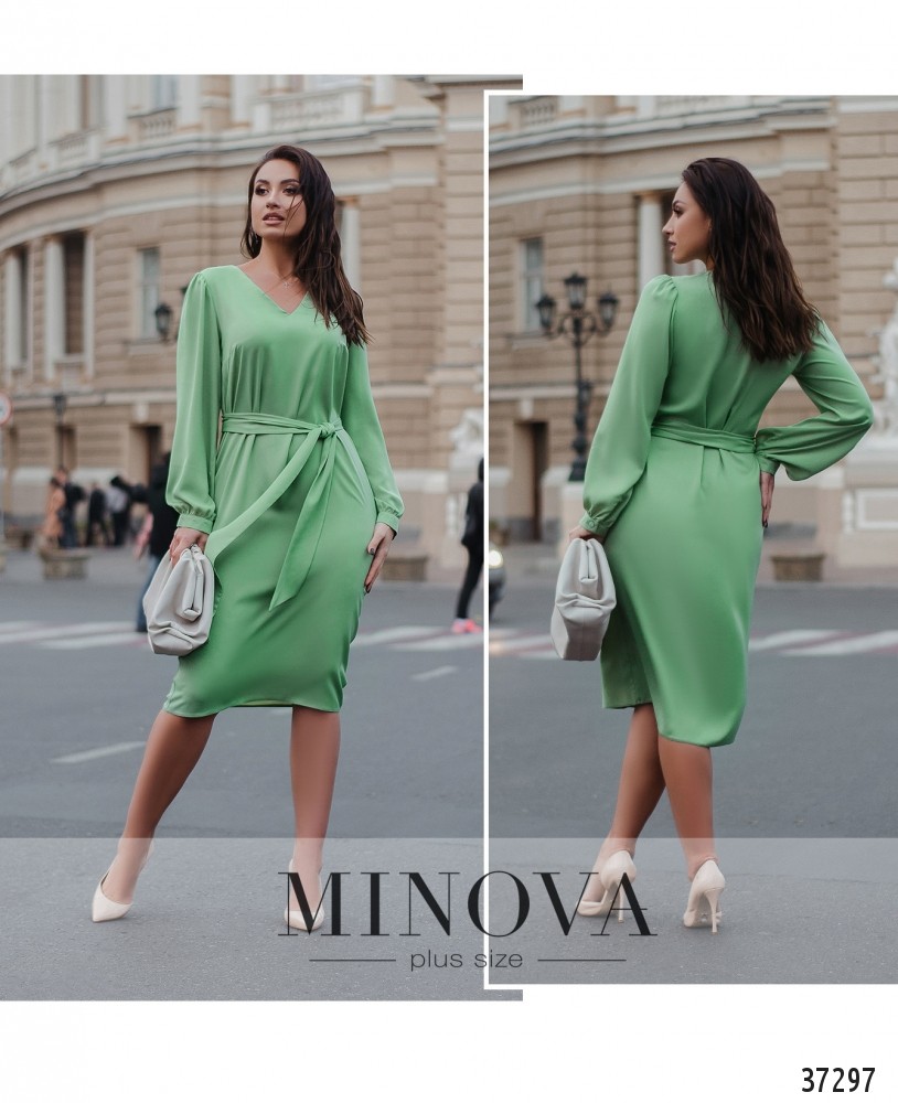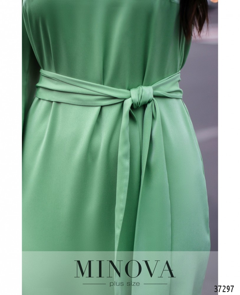 Минималистичное повседневное платье батал из лёгкой ткани. Крой свободный, в комплекте пояс. Рукава с мягкими манжетами, манжеты с одной пуговицей. Карманы и застёжки отсутствуют. Вырез декольте V-образный. Пояс/аксессуар входит в комплект.