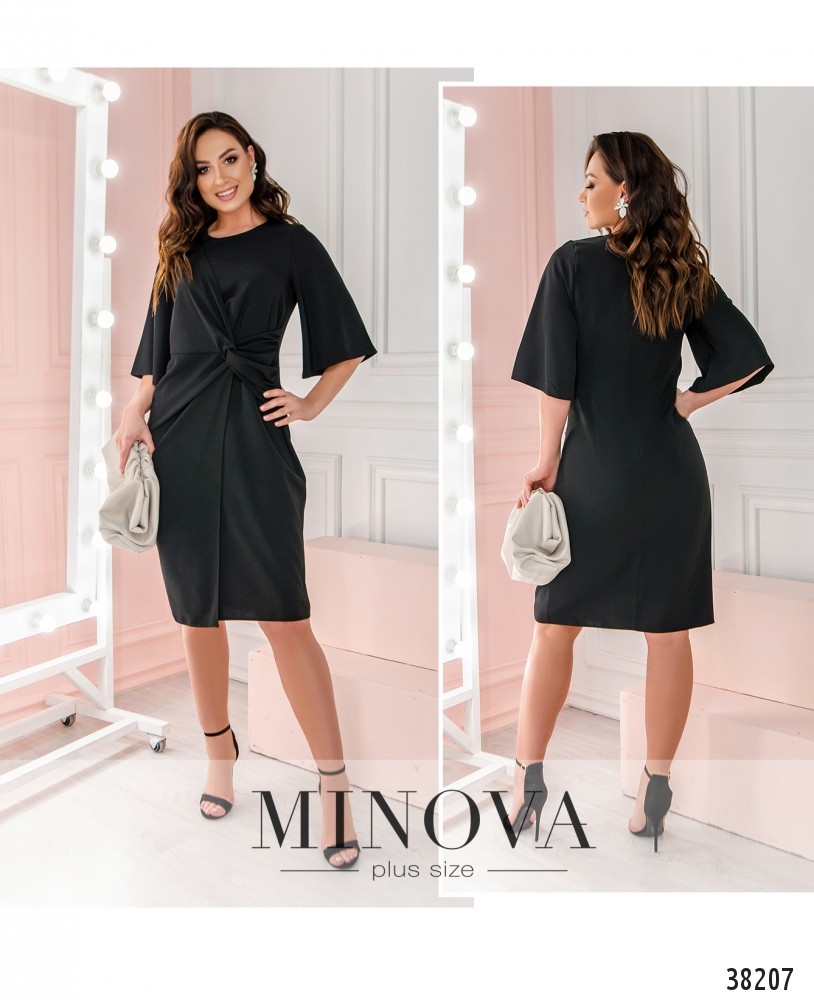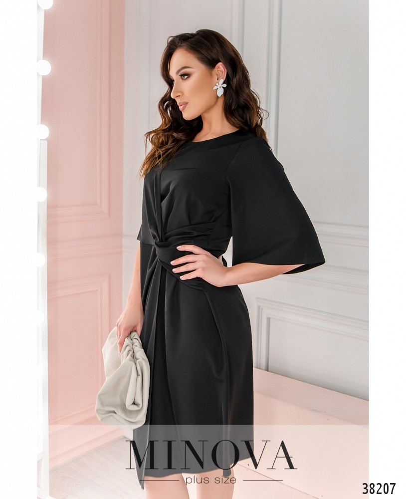 Оригинальное приталенное платье плюс сайз, подол слева присобран и «захвачен» широкой подшитой лентой, правая часть запахнута и подшита изнутри. Карманов нет. Рукава широкие, без манжет. Застёгивается на вшитую по спинке молнию. Вырез горловины полукруглый.