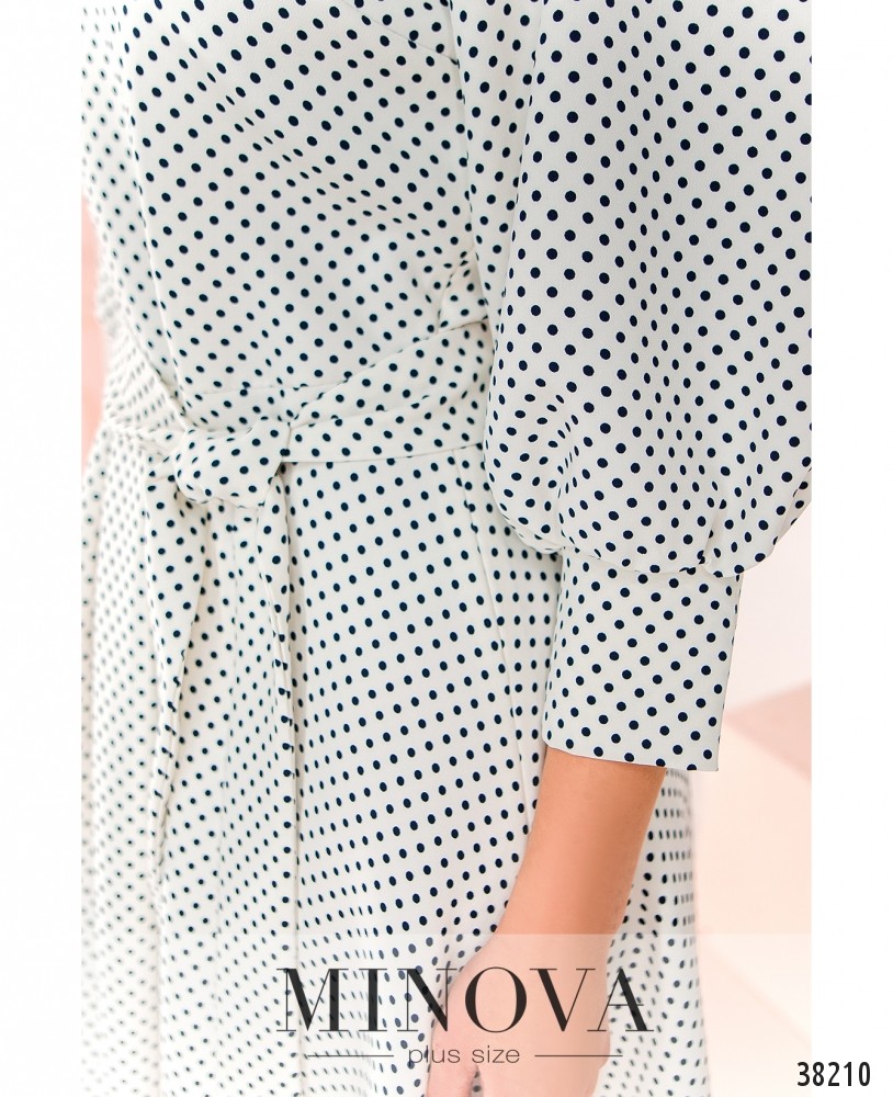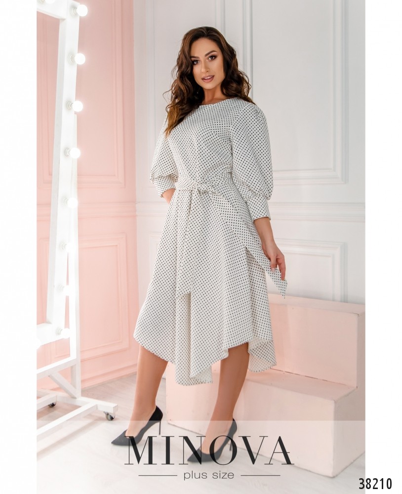 Яркое элегантное платье батал с асимметричным, скруглённым по бокам подолом. А-силуэт, карманов нет, в комплекте пояс. Застёгивается на потайную молнию, вшитую слева. Вырез горловины полукруглый. Подол подшит к верху и расклешён, с декоративными складками на талии. На груди вытачки. Рукава с мягкими манжетами без пуговиц.