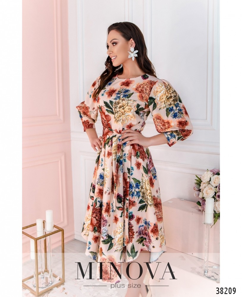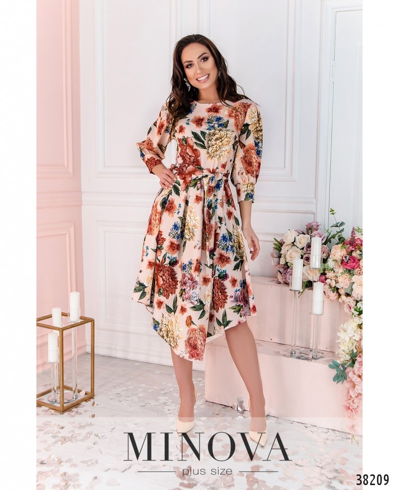Яркое элегантное платье батал с асимметричным, скруглённым по бокам подолом. А-силуэт, карманов нет, в комплекте пояс. Застёгивается на потайную молнию, вшитую слева. Вырез горловины полукруглый. Подол подшит к верху и расклешён, с декоративными складками на талии. На груди вытачки. Рукава с мягкими манжетами без пуговиц.