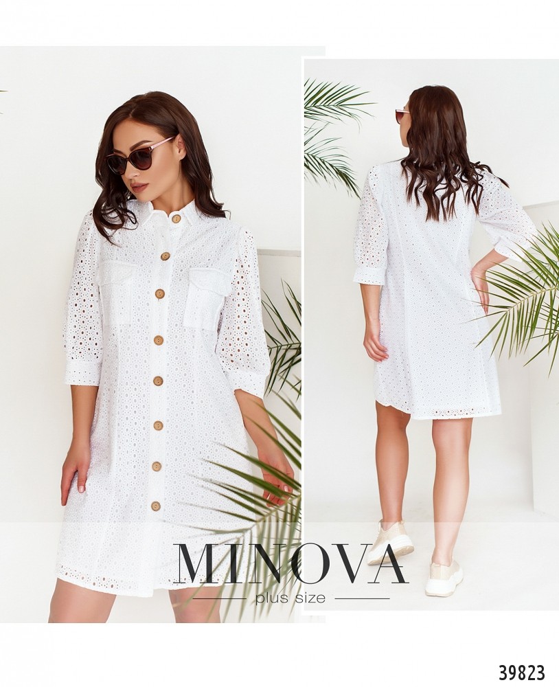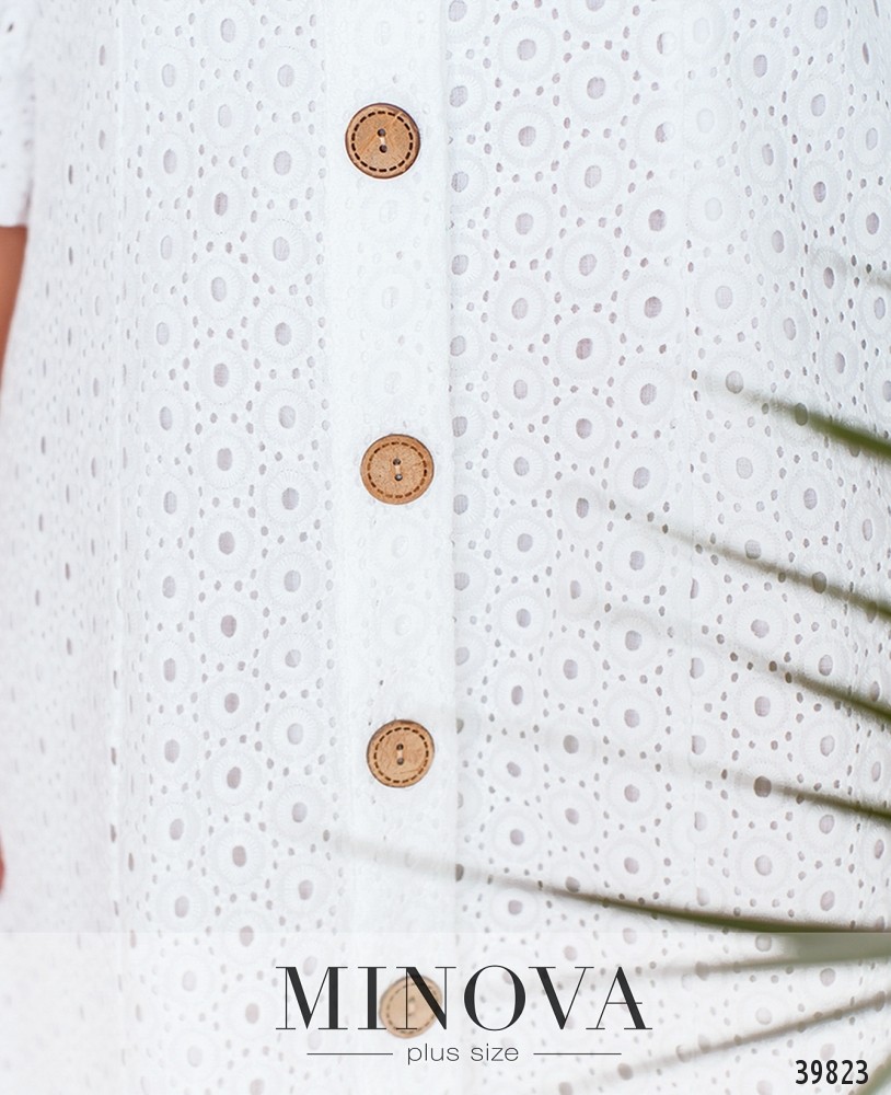 Ажурное платье батал с подшитым мягким нижним слоем. Рукава - удлинённые "фонарики" с манжетами, без пуговиц. Воротничок отложной, на груди - накладные карманы, застёгивается на ряд пуговиц спереди на планке.