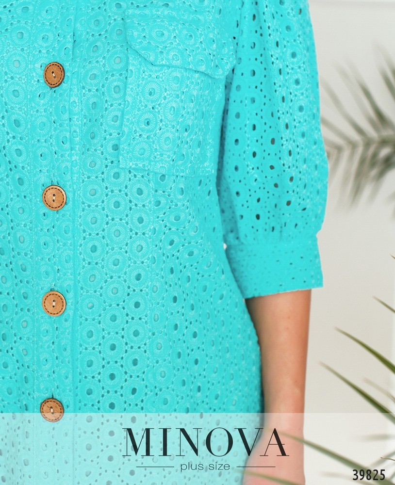 Ажурное платье батал с подшитым мягким нижним слоем. Рукава - удлинённые "фонарики" с манжетами, без пуговиц. Воротничок отложной, на груди - накладные карманы, застёгивается на ряд пуговиц спереди на планке.