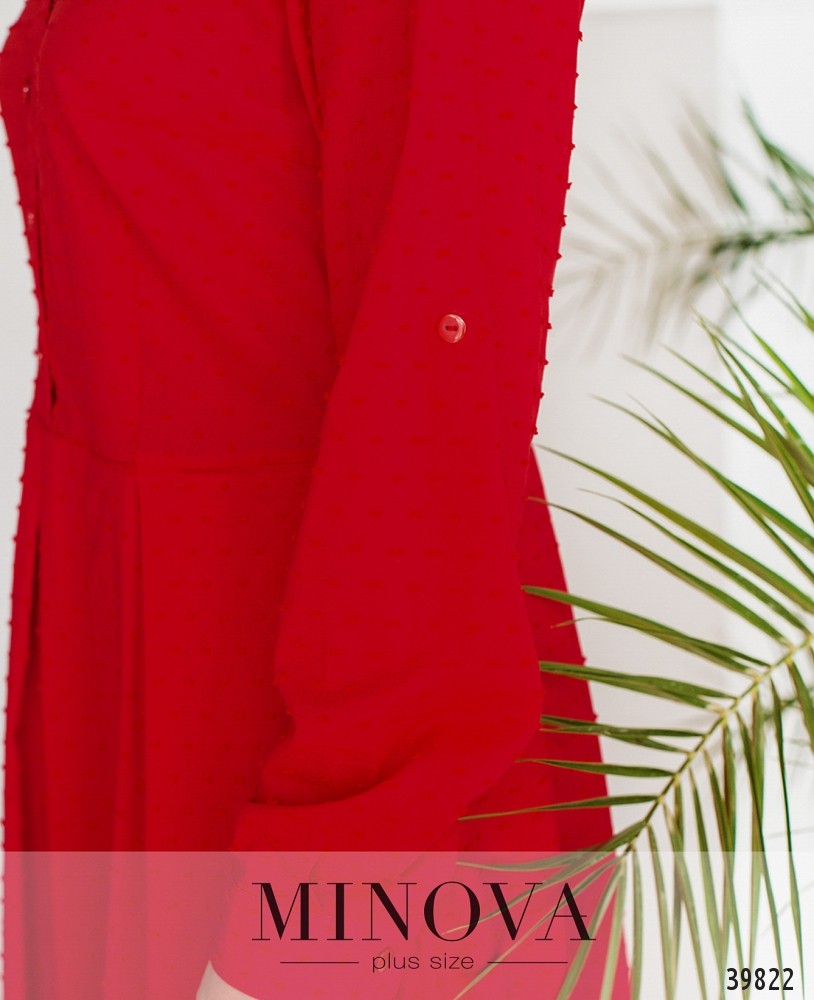 Привлекательное платье большого размера, лиф - в "рубашечном" стиле: отложной воротничок, рукава с манжетами, на манжетах по одной пуговице, ряд пуговиц спереди на планке, до подола. Подол подшит к лифу, расклешён, с мягким нижним слоем. На груди вытачки. Рукав функциональный: полная длина или подворачивается до уровня 3/4 и застегивается на патик с пуговицей. Платье застегивается сбоку на потайную молнию.