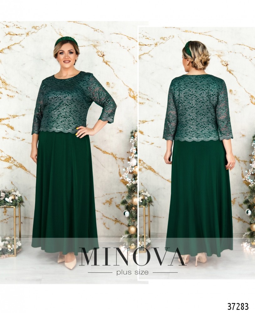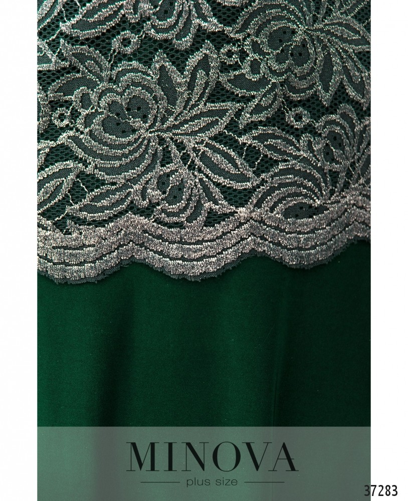 Вечернее платье батал А-силуэта из мягкой ткани с подшитой сверху кружевной накидкой. Рукава кружевные, без подкладки и манжет. Вырез горловины полукруглый. Подол расклешён. Карманов и застёжек нет. На груди вытачки.