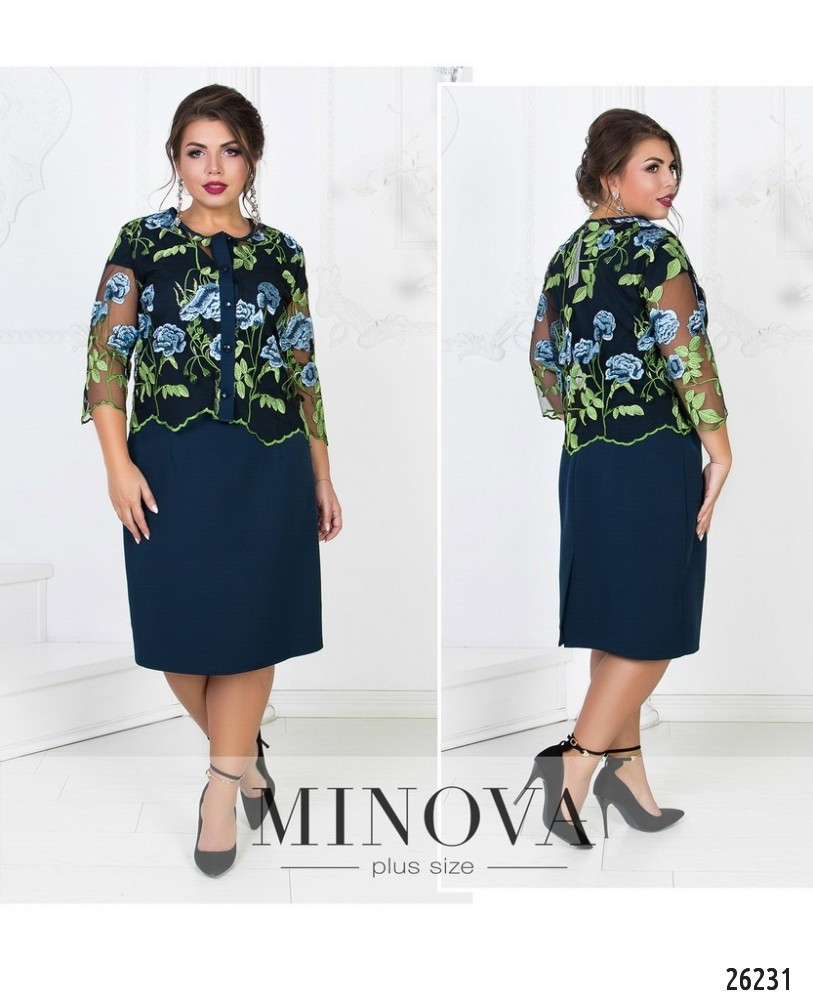 Элегантный костюм-двойка состоит из однотонного платья и болеро из сетки с вышивкой. Приталенное платье с короткими рукавами и аккуратным V-образным вырезом. На спине скрытая молния и разрез по линии шага. Болеро с рукавами ¾ застегивается на пуговицы, пришитые на контрастную планку в тон платья. Рукава и подол выполнены с неровными краями, имитирующими форму листа.