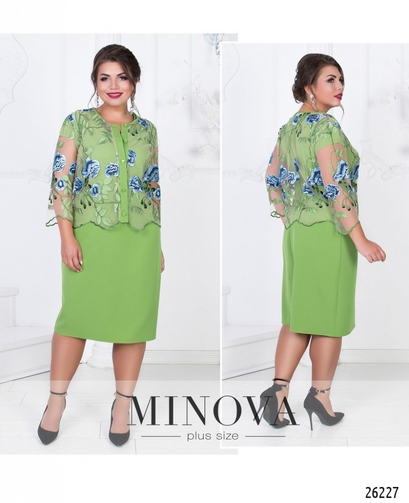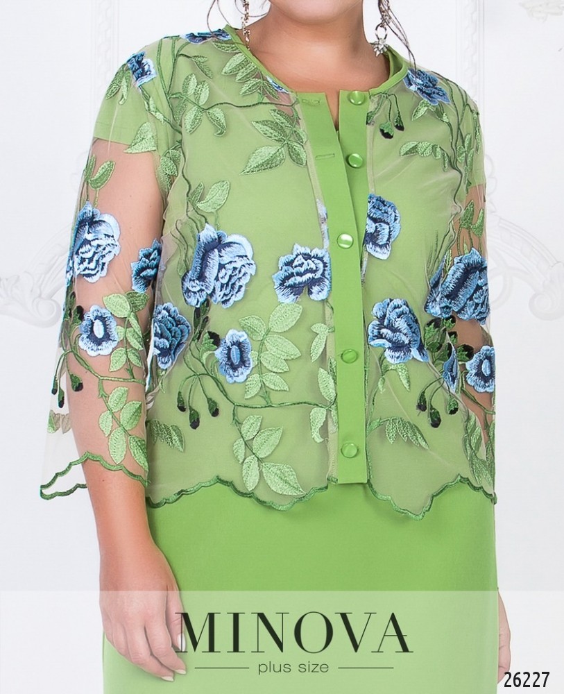 Элегантный костюм-двойка состоит из однотонного платья и болеро из сетки с вышивкой. Приталенное платье с короткими рукавами и аккуратным V-образным вырезом. На спине скрытая молния и разрез по линии шага. Болеро с рукавами ¾ застегивается на пуговицы, пришитые на контрастную планку в тон платья. Рукава и подол выполнены с неровными краями, имитирующими форму листа.