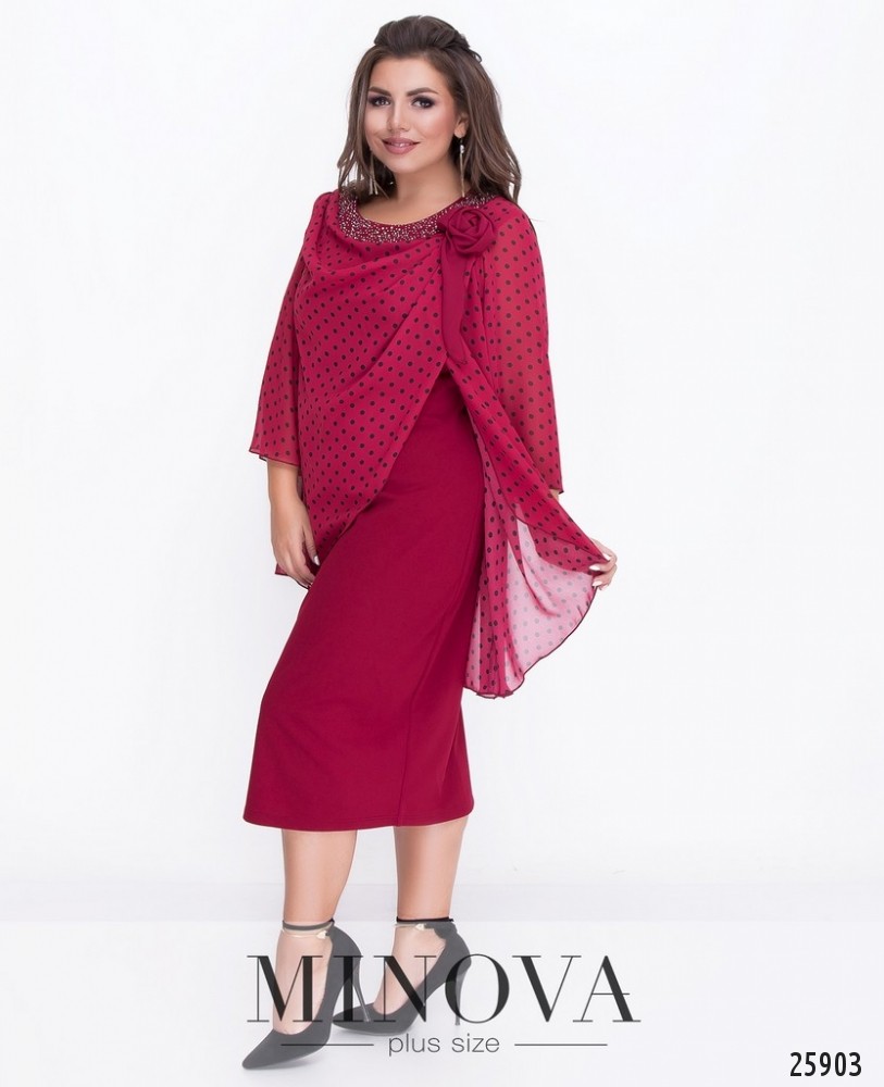 Платье с пришитой драпированной накидкой с мелкими стразами и объемным цветком. Нижний слой – платье футляр из плотной однотонной ткани. Верхний слой – полупрозрачный шифон с рисунком. Накидка удлинена на спине. Свободные рукава длиной ¾. Изделие без молний и застежек.