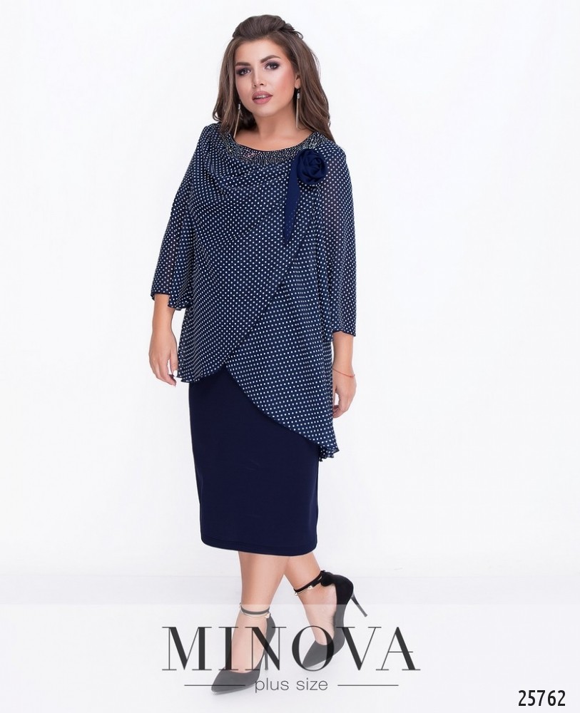 Платье с пришитой драпированной накидкой с мелкими стразами и объемным цветком. Нижний слой – платье футляр из плотной однотонной ткани. Верхний слой – полупрозрачный шифон с рисунком. Накидка удлинена на спине. Свободные рукава длиной ¾. Изделие без молний и застежек.