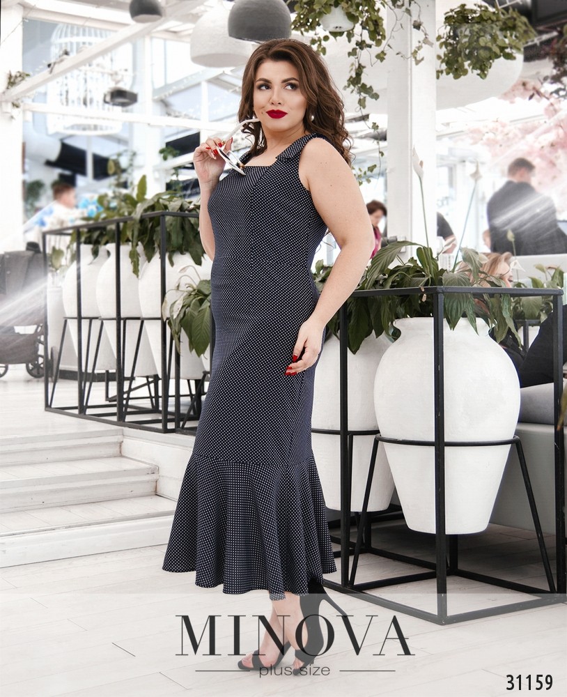 Эффектная женственная модель в мелкий горошек. Платье по фигуре силуэта «русалака» с отрезным подолом с воланами. Линия декольте выполнена в форме квадрата с широкими бретелями. Бретели украшены лентами в тон. На спине платье застегивается на скрытую молнию.