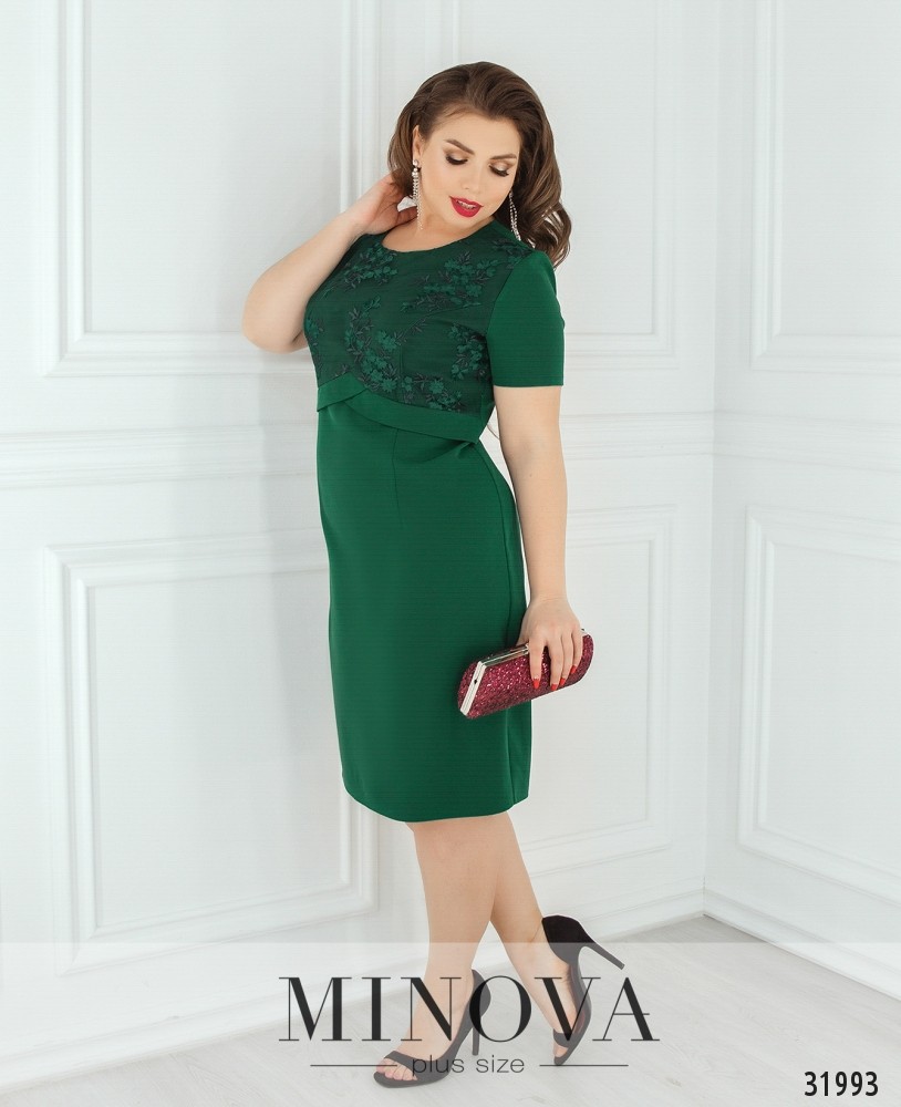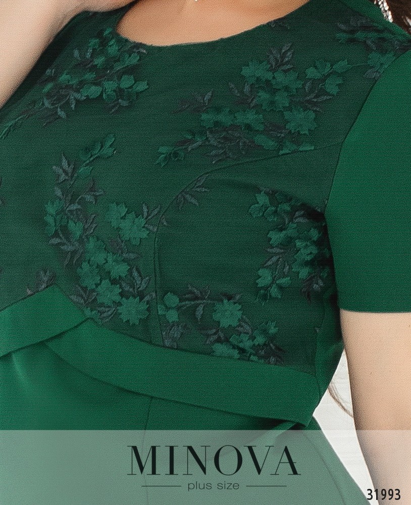 Элегантное платье с отделкой из сетки с вышивкой. Платье выполнено из однотонного материала. Лиф платья дополнен верхним слоем, представленным сеткой с вышивкой. Талия подчеркнута двумя фигурными линиями. На спине вшитая молния и разрез по линии шага.
