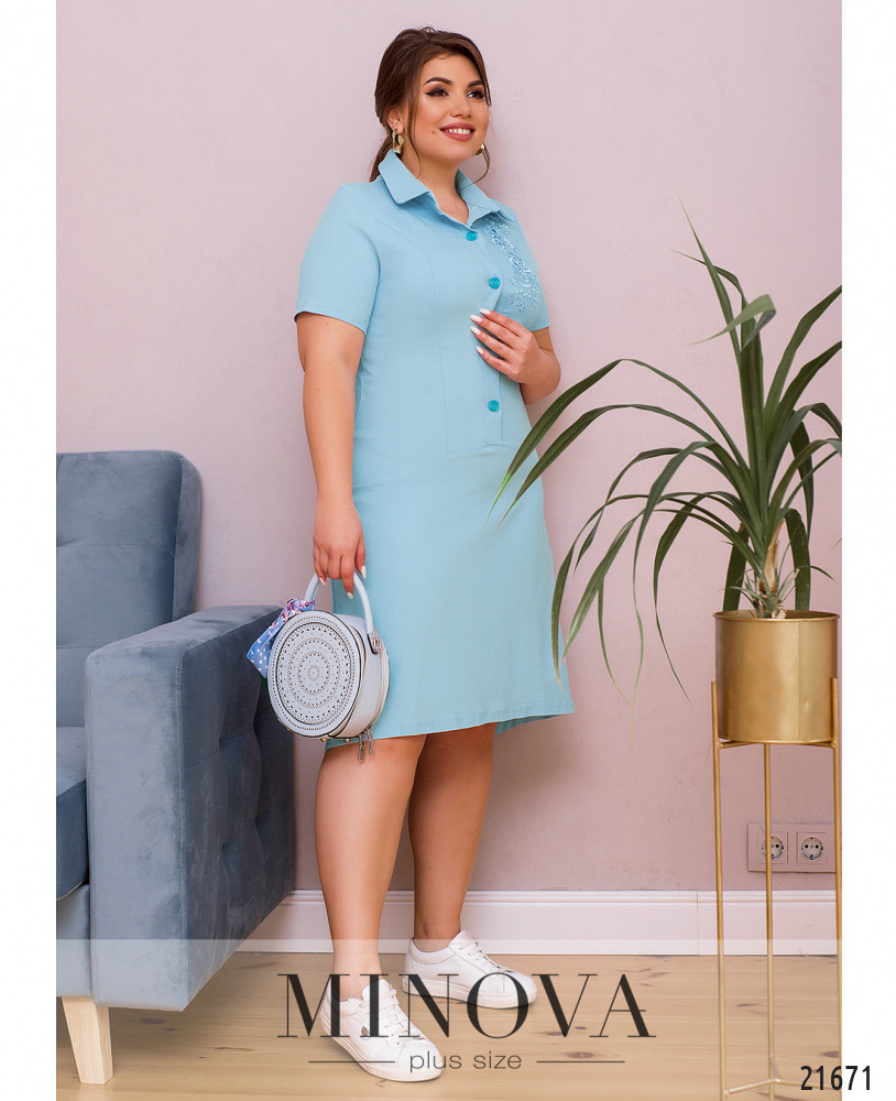 Элегантное и женственное платье с вышивкой-аппликацией с бусинами на плече. Подол отрезной полукруглым швом, асимметричный, по спинке чуть длиннее. Карманов нет. Воротничок отложной, рукава без манжет, на груди полукруглые вытачки до талии. Застёжка - ряд пуговиц спереди на планке.