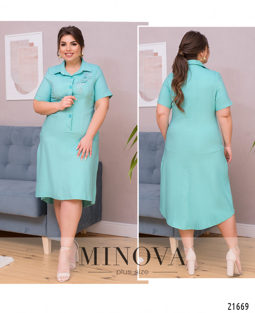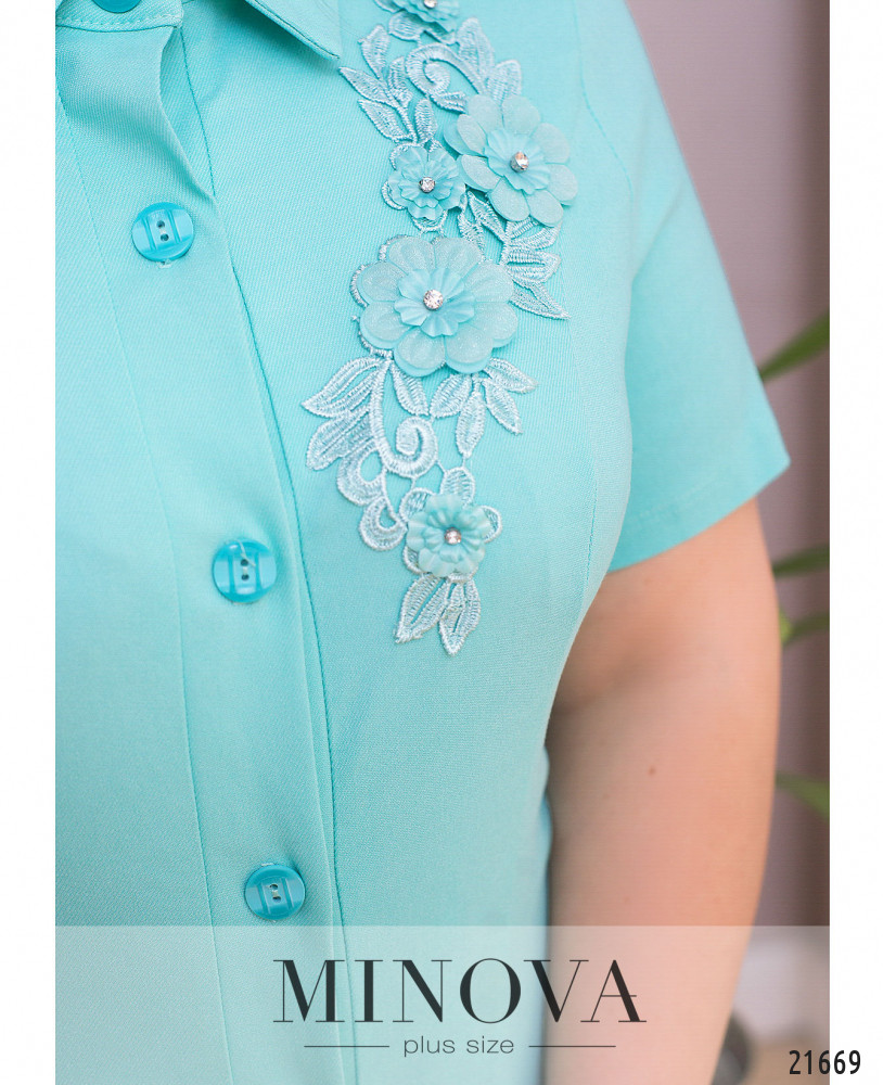 Элегантное и женственное платье с вышивкой-аппликацией с бусинами на плече. Подол отрезной полукруглым швом, асимметричный, по спинке чуть длиннее. Карманов нет. Воротничок отложной, рукава без манжет, на груди полукруглые вытачки до талии. Застёжка - ряд пуговиц спереди на планке.