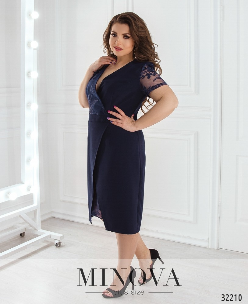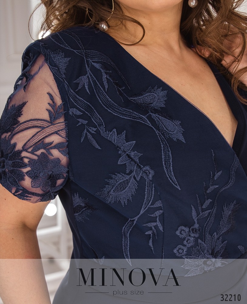 Платье «конверт» с вставкой из сетки с вышивкой. Платье с отрезной линией талии, лифом и подолом на запАх. Короткие рукава выполнены из сетки с вышивкой. Лиф с одной стороны дополнен сеткой. Подол так же дополнен сеткой с вышивкой. На спине платье застегивается на вшитую молнию и дополнено разрезом по линии шага.