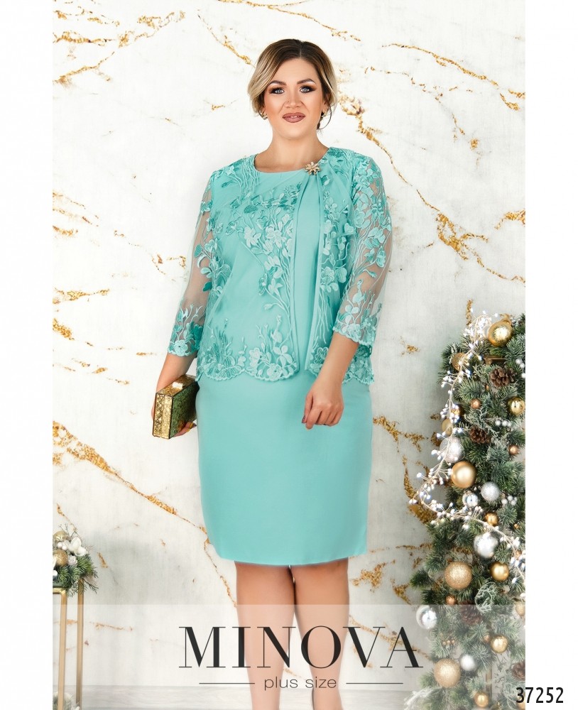 Праздничное элегантное платье большого размера, крой прямой, сверху подшита накидка из полупрозрачной сеточки с вышивкой. Украшено небольшой брошью в виде цветка. Рукава полупрозрачные, без подкладки и без манжет. Карманов и застёжек нет. Вырез горловины широкий, полукруглый.