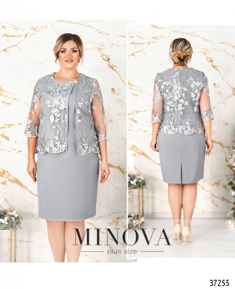 Праздничное элегантное платье большого размера, крой прямой, сверху подшита накидка из полупрозрачной сеточки с вышивкой. Украшено небольшой брошью в виде цветка. Рукава полупрозрачные, без подкладки и без манжет. Карманов и застёжек нет. Вырез горловины широкий, полукруглый.