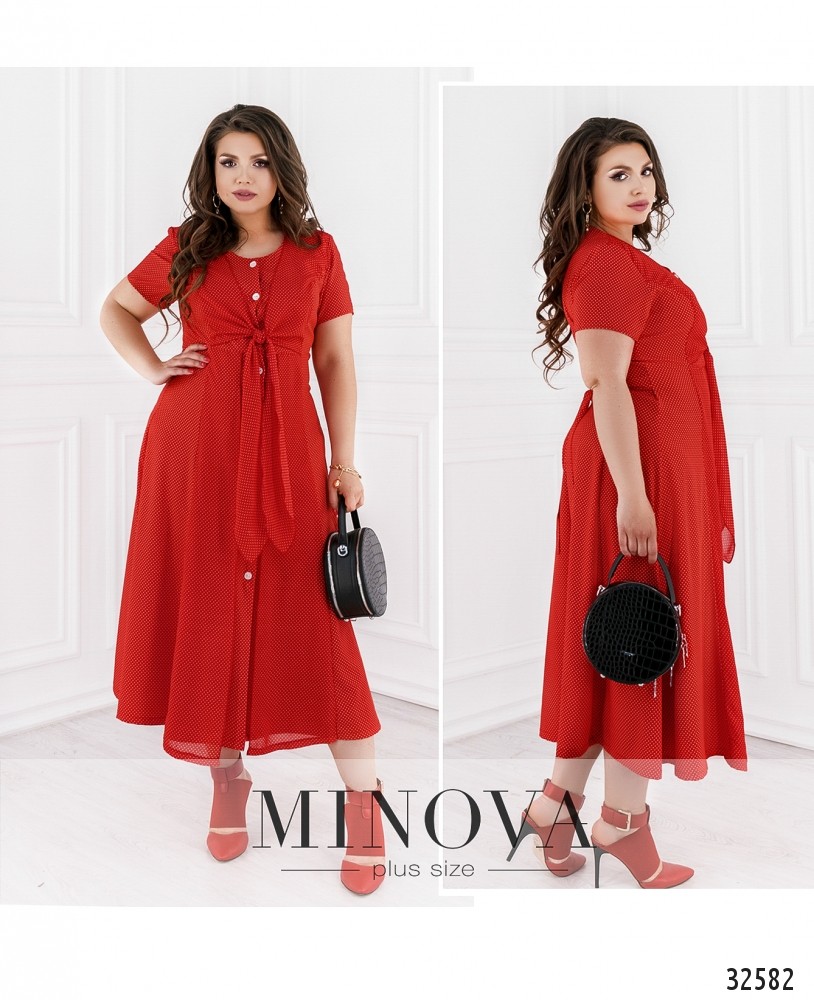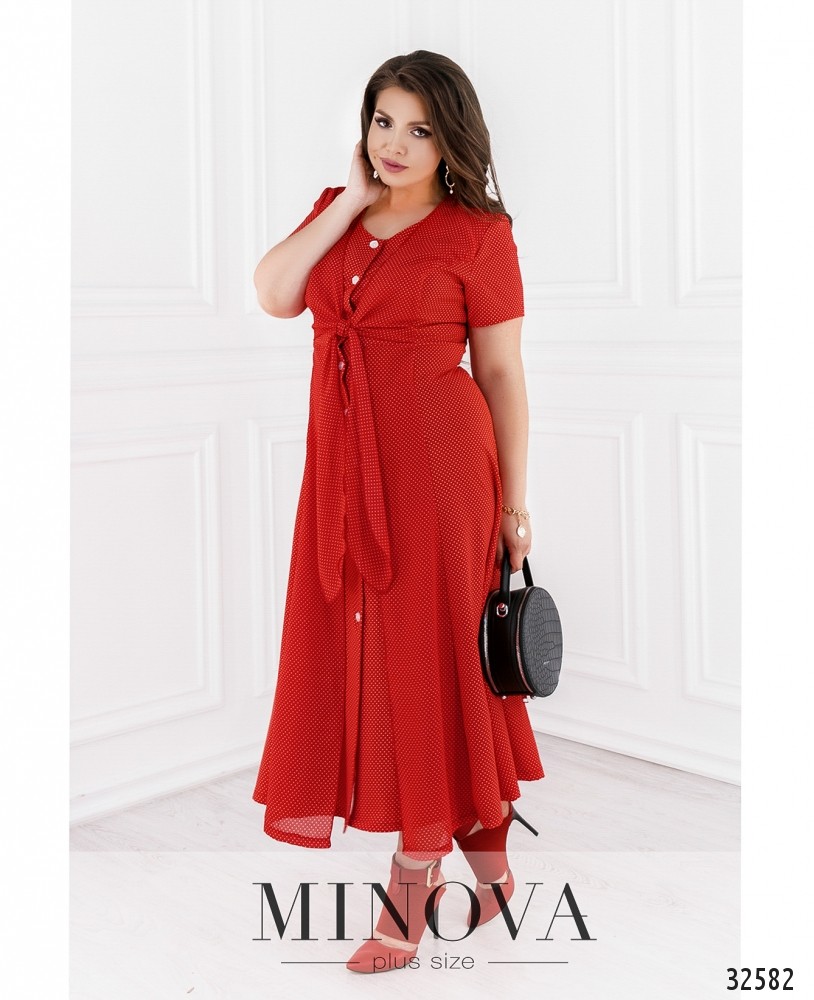 Яркое, летнее, такое свободное платье с запАхом в мелкий горох – из новой летней коллекции платьев большого размера от Minova. Кроме запАха, застёгивается на пуговицы до низу, сзади на талии тоже есть завязки, с помощью которых можно регулировать очертания талии. Платье А-силуэта, очень расклешено к низу, ткань отлично тянется и «дышит». Такой броский наряд можно надеть и на прогулку, и на пляж, и даже в офис – когда начальство в отпуске! Благодаря регулировке пояса и завязок, будет выгодно смотреться на девушках с фигурой «песочные часы», «треугольник» и «прямоугольник».