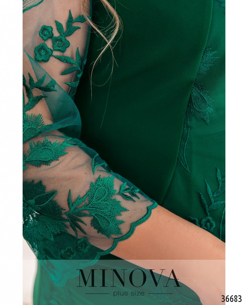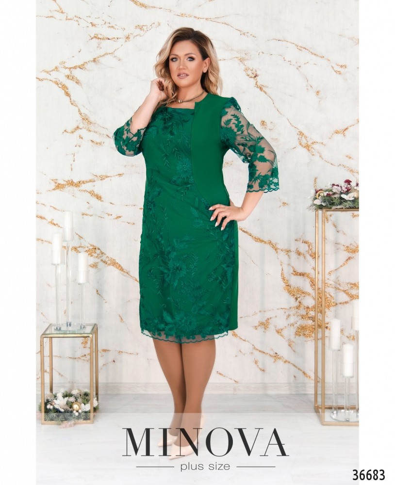 Приталенное платье батал из свежей коллекции женской одежды больших размеров от Minova покорит ваше сердце с первого взгляда своим оригинальным фасоном. Платье А-силуэта, с полукруглым вырезом горловины, без карманов и застёжек. На плечи изнутри подшиты накладки, которые делают линию плеч более ровной. Платье двуслойное спереди: от горловины до подола подшит второй слой из сеточки с цветочным узором. Визуально платье выглядит, словно на него накинута жилетка из гладкой ткани. Спинка полностью гладкая. Рукава длиной ¾. Платье будет хорошо сочетаться с однотонной обувью на каблуке любой высоты.