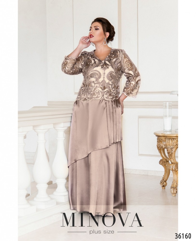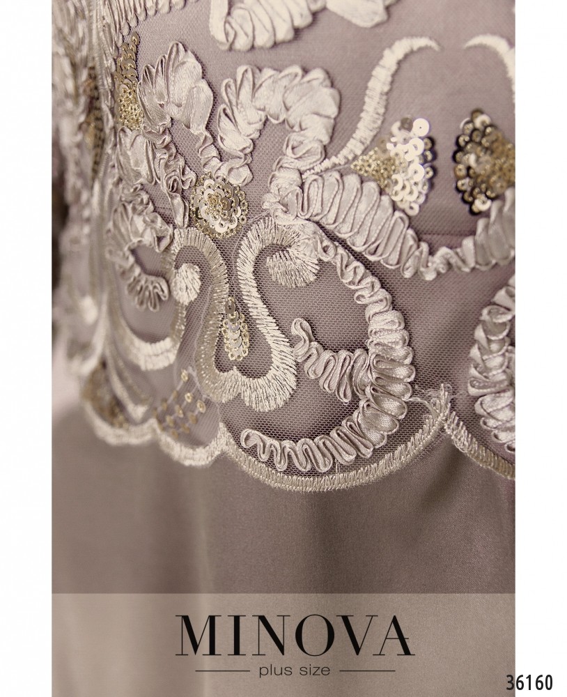 Необычный фасон представленного в новом каталоге Minova платья батал делает эту модель праздничной, нарядной и привлекательной. Платье сочетает шелковистую ткань подола и подкладки и ажурную сеточку с пайетками и лентами, создающими цветочный узор. Платье А-силуэта, на подоле – плиссированные складки и несколько слоёв, благодаря чему он выглядит более объёмным. Сверху к лифу подшита накидка, рукава без подкладки, длиной ¾. Вырез горловины полукруглый, неглубокий. Застёжка – вшитая по спинке змейка, карманов нет. Прекрасный выбор для вечеринки или более официального торжественного мероприятия.