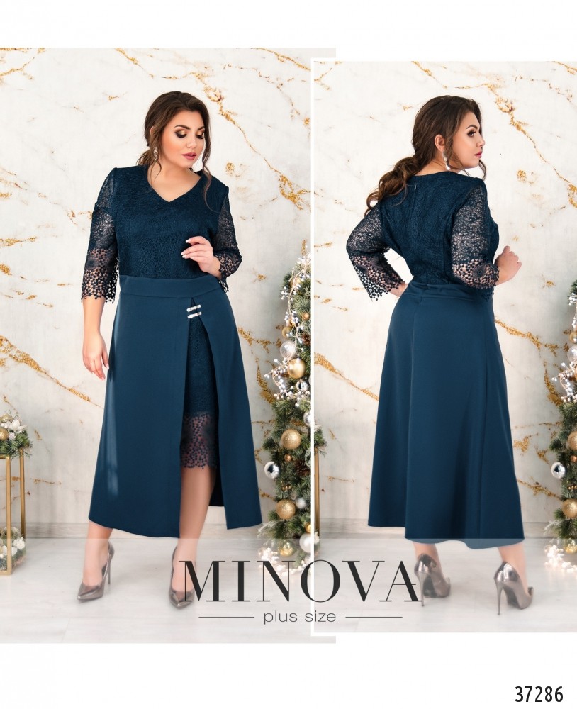 Романтичное платье батал с ажурным кружевом на лифе и гладким подолом. Лиф с подкладкой, на подоле треугольный разрез с кружевной подкладкой, под кружевом – мягкая подкладка. Вырез горловины неглубокий, V-образный. Застёгивается на потайную молнию сзади на спине. На подоле декоративные металлические нашивки, скрепляющие вырез. Рукава из кружева без подкладки, без манжет.